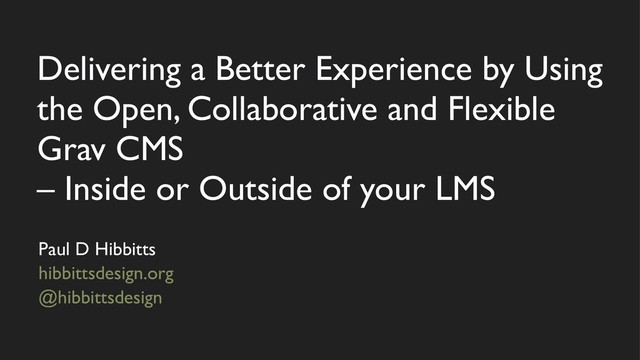 Want to provide students and course facilitators a better online experience but still want or need to use the existing institutional LMS? Faced with this exact challenge, Paul Hibbitts started to develop a set of components in 2016 for the modern Grav Content Management System (getgrav.org) to partner with his institution's LMS (Canvas). Grav leverages forward-looking standards such as Markdown for platform-independent content and enables Git-based (i.e. GitHub, GitLab, GitBook, etc.) collaborative workflows, both which naturally also supports the 5 Rs of Open Educational Resources. In addition, the ability to use GitHub Desktop (desktop.github.com) for mirroring Git-based content to one’s own computer for backup and editing with the tools of your choice not only brings peace of mind but also a highly efficient workflow.