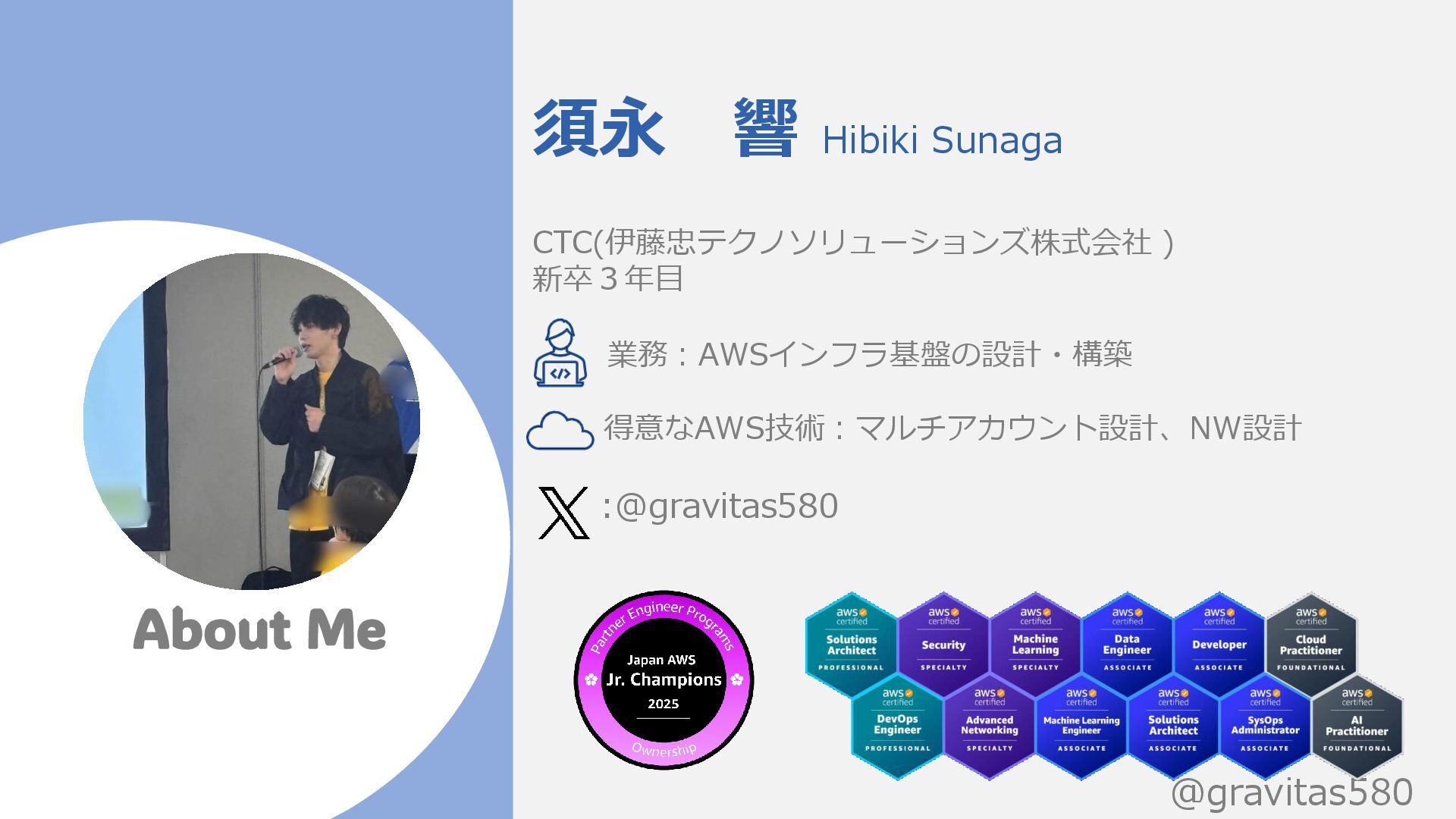 @gravitas580 須永 響 Hibiki Sunaga CTC(伊藤忠テクノソリューションズ株式会社 ) 新卒3年目 業務:AWSインフラ基盤の設計・構築 得意なAWS技術:マルチアカウント設計、NW設計