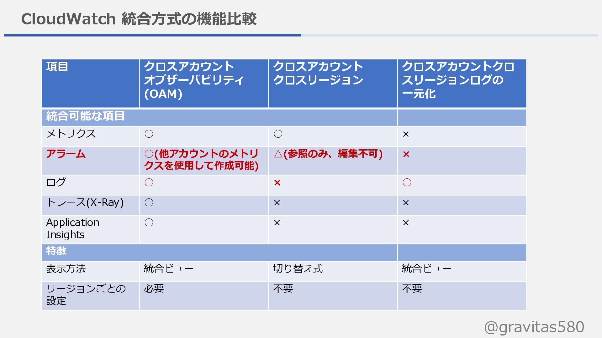 @gravitas580 CloudWatch 統合方式の機能比較 項目 クロスアカウント オブザーバビリティ (OAM) クロスアカウント クロスリージョン クロスアカウントクロ