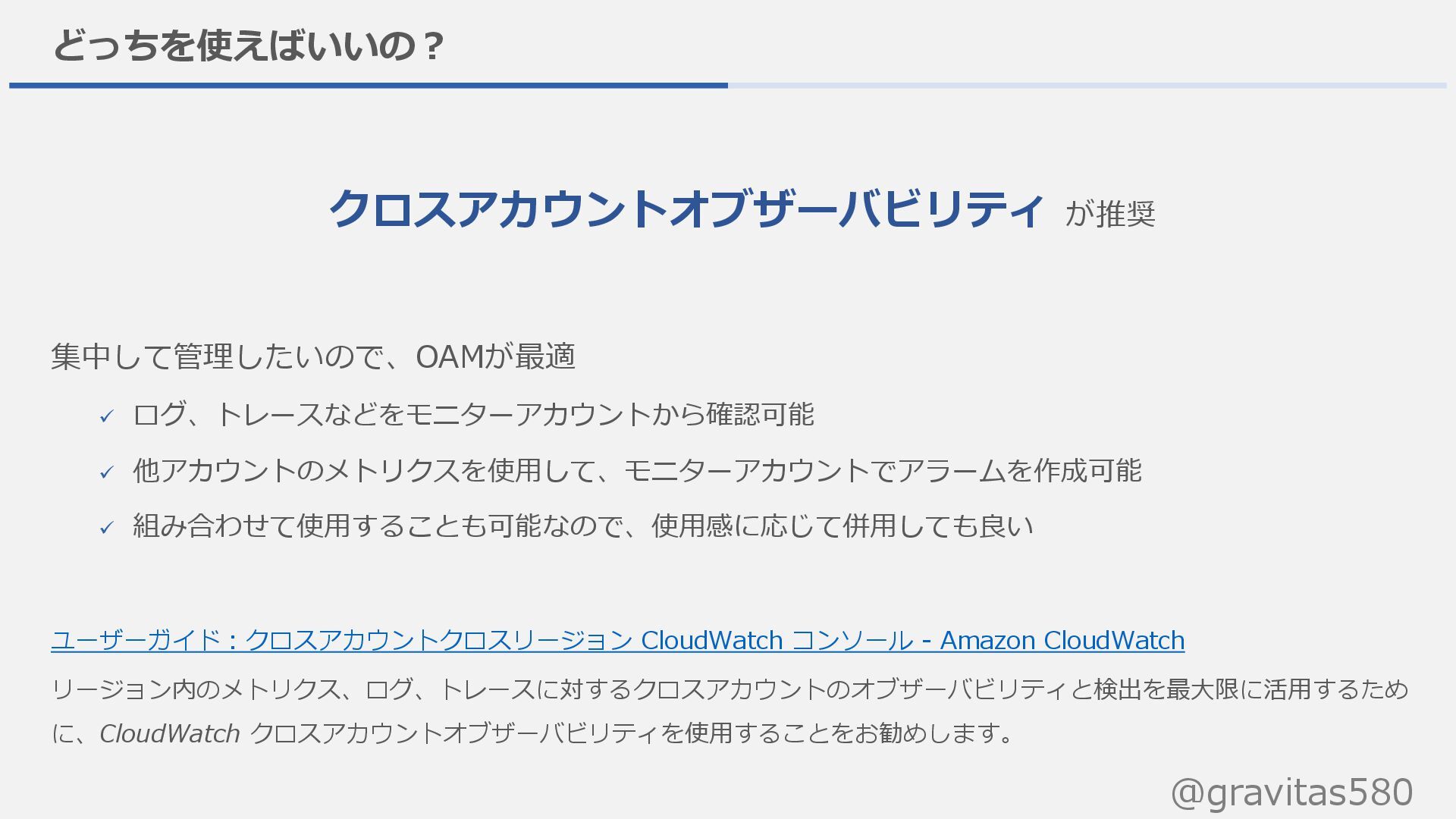 @gravitas580 どっちを使えばいいの? クロスアカウントオブザーバビリティ が推奨 集中して管理したいので、OAMが最適 ✓ ログ、トレースなどをモニターアカウントから確認可能 ✓ 他アカウントのメトリクスを使用して、モニターアカウントでアラームを作成可能 ✓