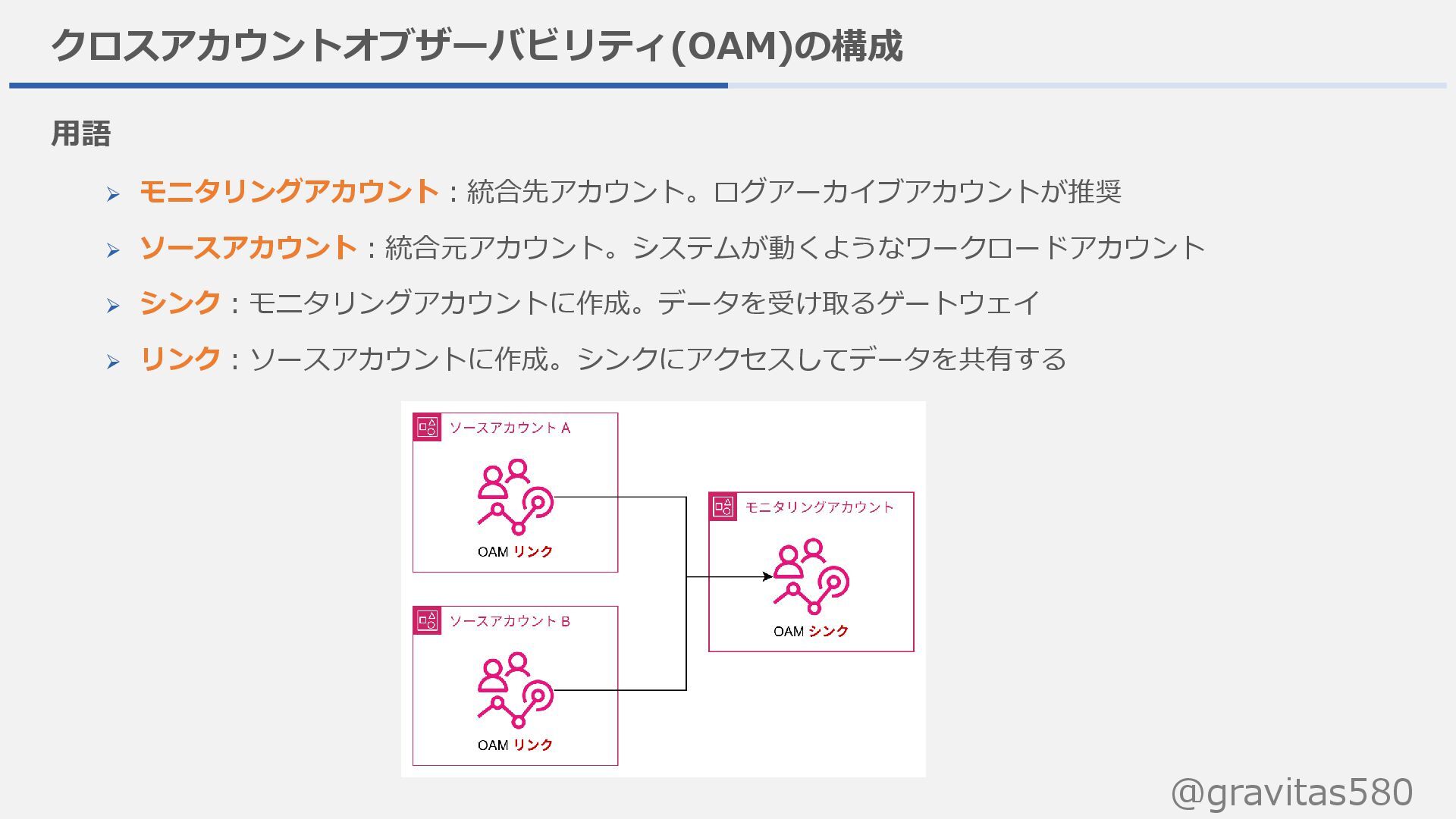 @gravitas580 クロスアカウントオブザーバビリティ(OAM)の構成 用語 ➢ モニタリングアカウント:統合先アカウント。ログアーカイブアカウントが推奨 ➢ ソースアカウント:統合元アカウント。システムが動くようなワークロードアカウント ➢ シンク:モニタリングアカウントに作成。データを受け取るゲートウェイ ➢