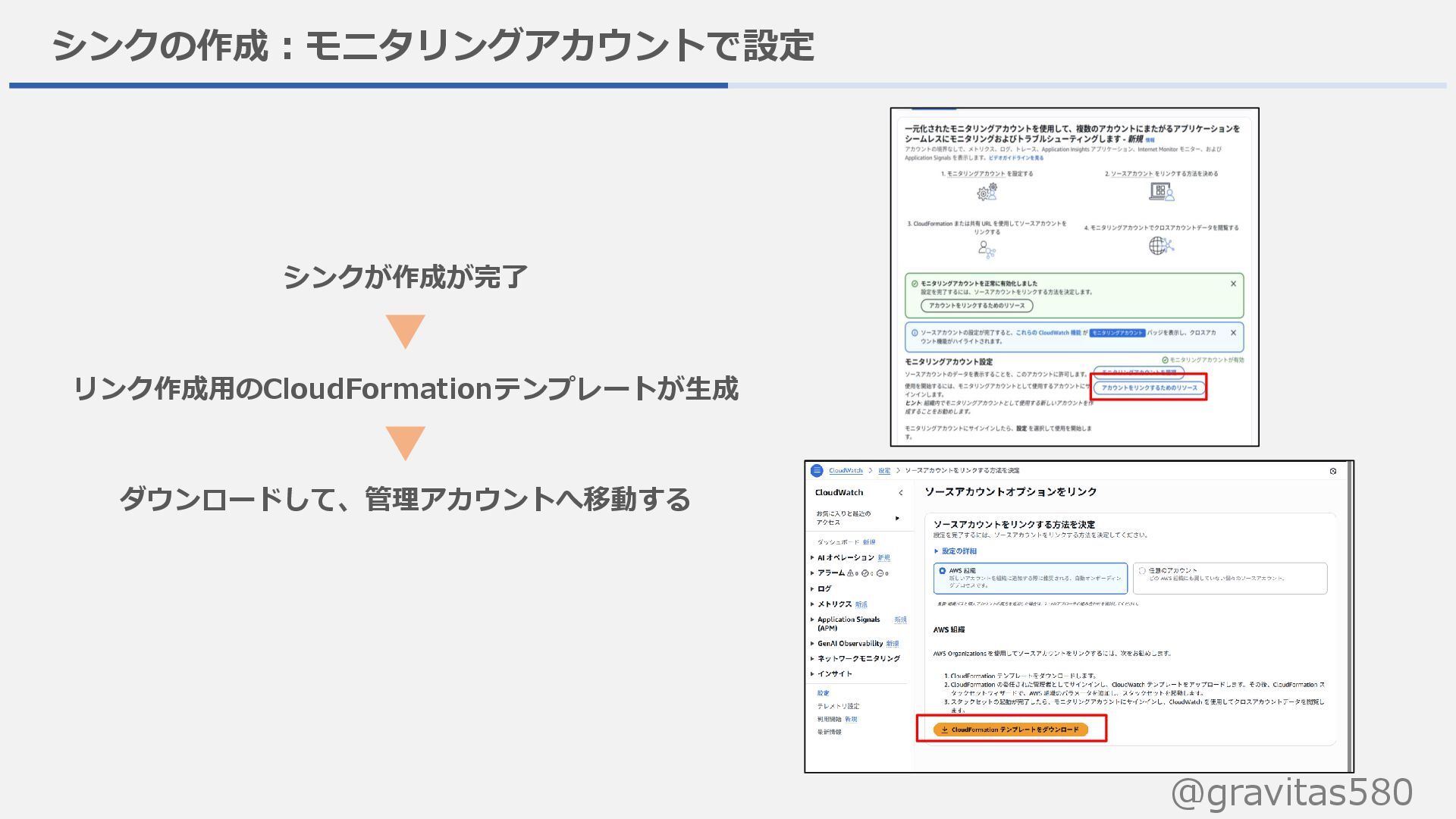 @gravitas580 シンクの作成:モニタリングアカウントで設定 シンクが作成が完了 リンク作成用のCloudFormationテンプレートが生成 ダウンロードして、管理アカウントへ移動する