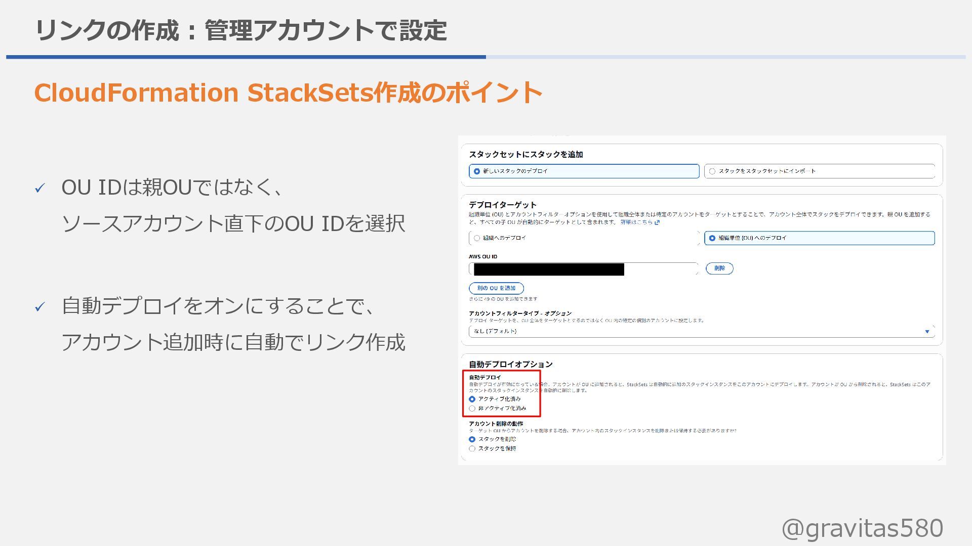 @gravitas580 リンクの作成:管理アカウントで設定 CloudFormation StackSets作成のポイント ✓ OU IDは親OUではなく、 ソースアカウント直下のOU IDを選択 ✓