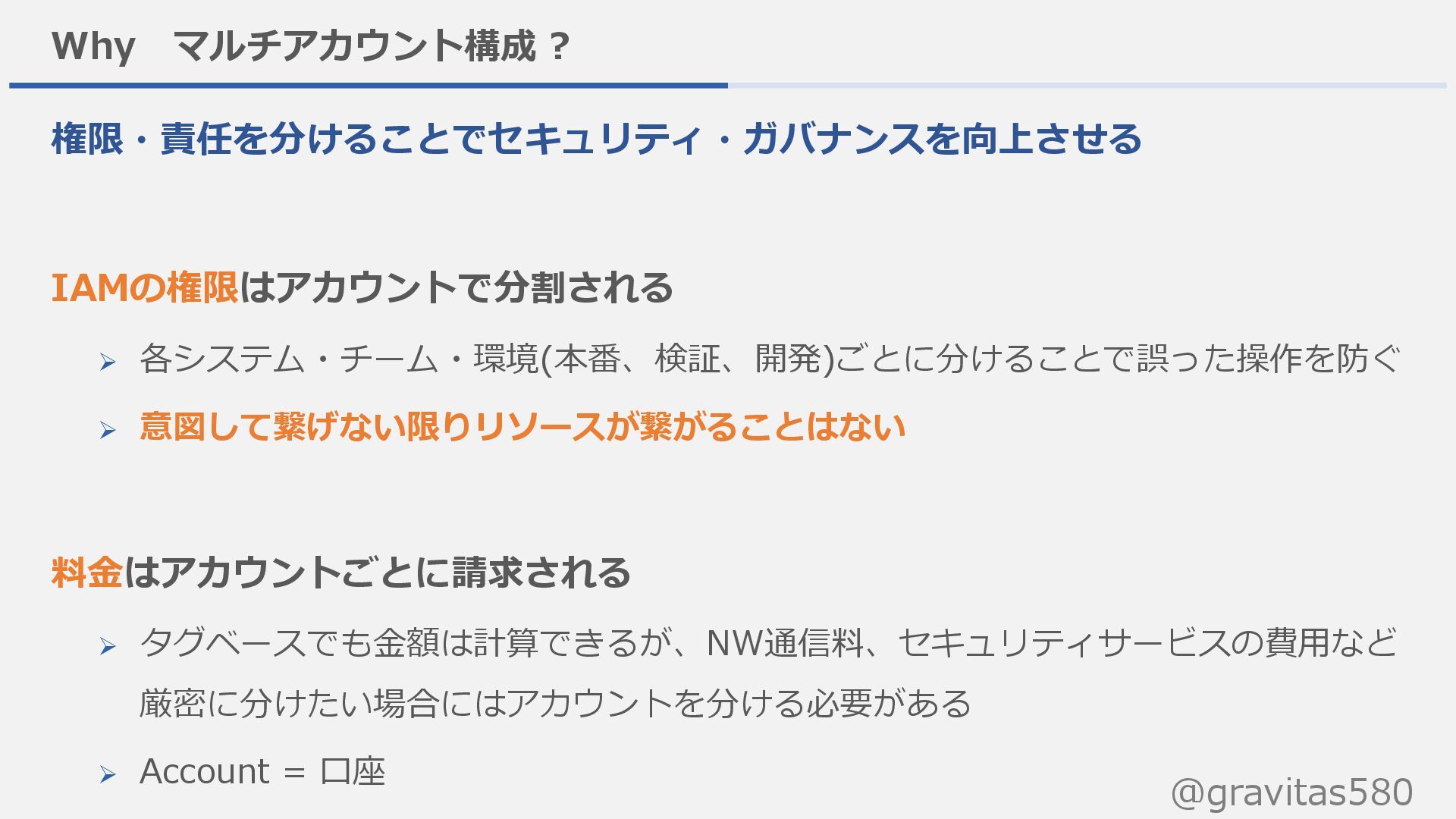 @gravitas580 Why マルチアカウント構成 ? 権限・責任を分けることでセキュリティ・ガバナンスを向上させる IAMの権限はアカウントで分割される ➢ 各システム・チーム・環境(本番、検証、開発)ごとに分けることで誤った操作を防ぐ ➢ 意図して繋げない限りリソースが繋がることはない