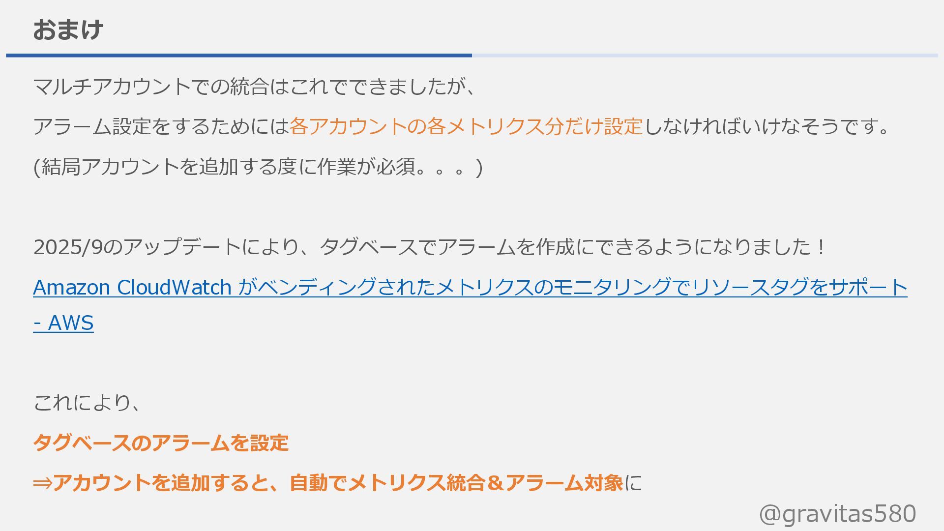@gravitas580 おまけ マルチアカウントでの統合はこれでできましたが、 アラーム設定をするためには各アカウントの各メトリクス分だけ設定しなければいけなそうです。 (結局アカウントを追加する度に作業が必須。。。) 2025/9のアップデートにより、タグベースでアラームを作成にできるようになりました! Amazon CloudWatch がベンディングされたメトリクスのモニタリングでリソースタグをサポート -