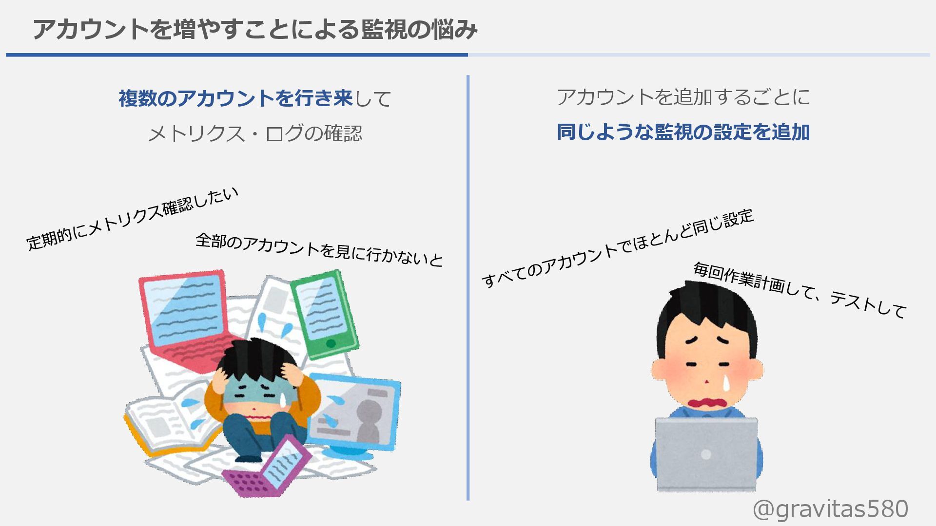 @gravitas580 アカウントを増やすことによる監視の悩み 複数のアカウントを行き来して メトリクス・ログの確認 アカウントを追加するごとに 同じような監視の設定を追加