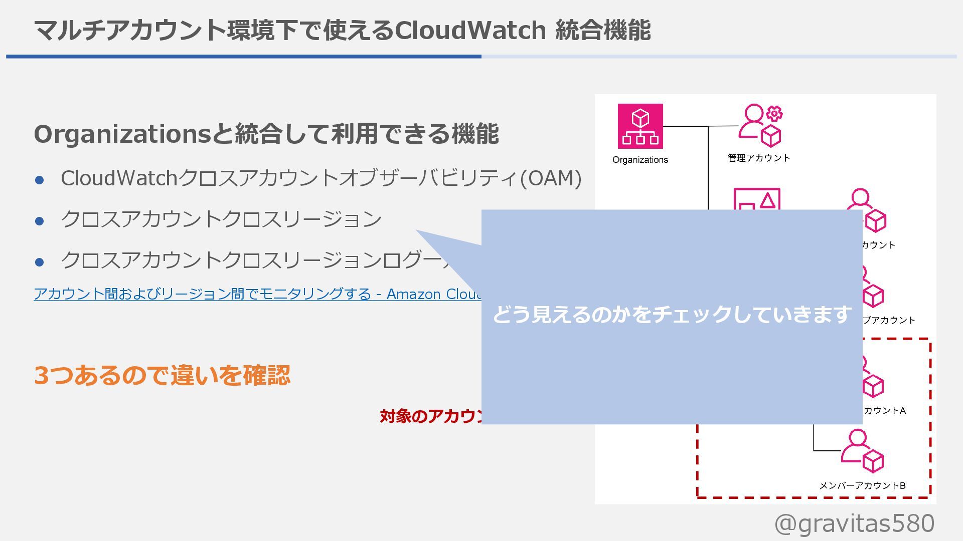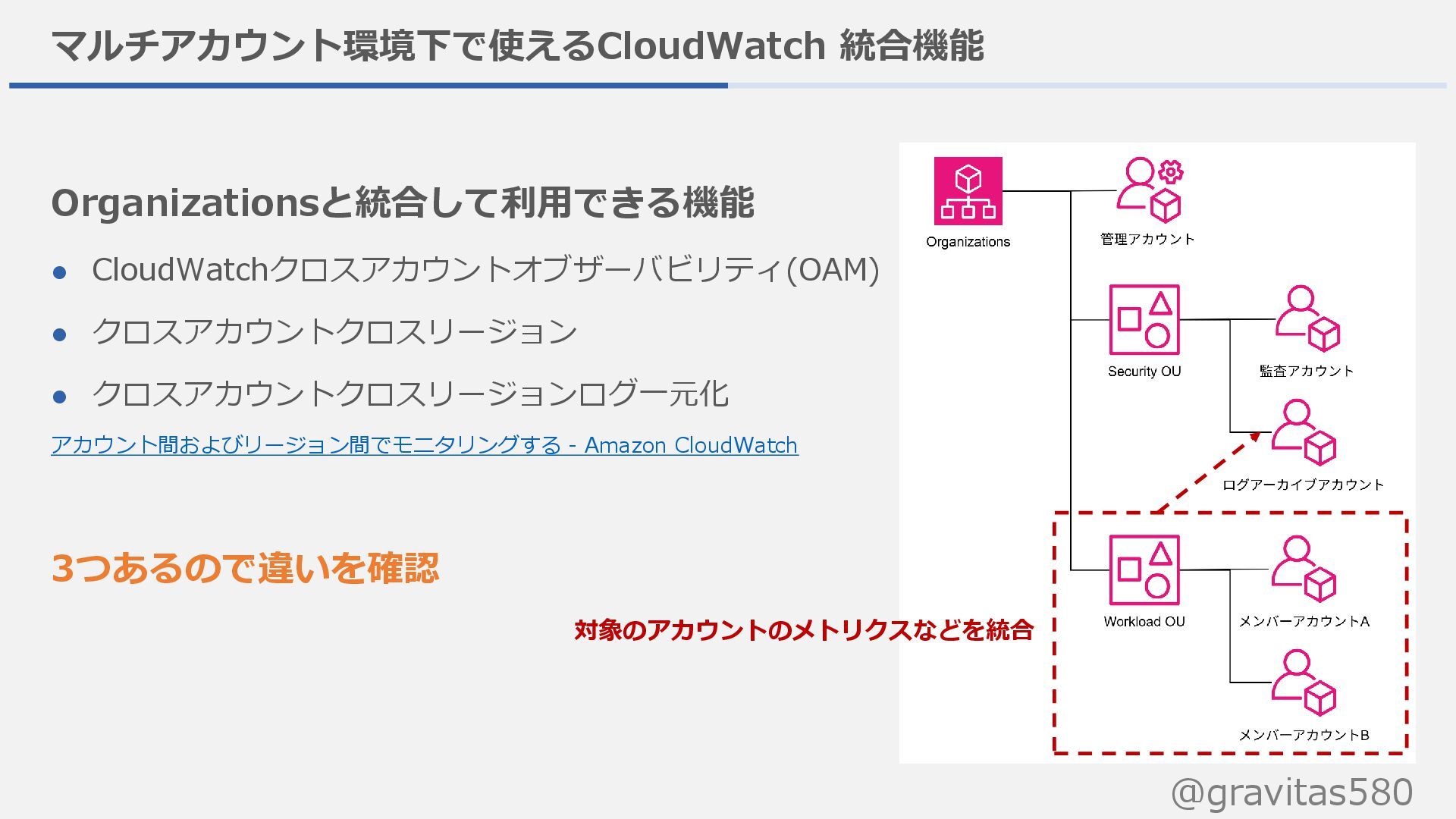 @gravitas580 マルチアカウント環境下で使えるCloudWatch 統合機能 Organizationsと統合して利用できる機能 ⚫ CloudWatchクロスアカウントオブザーバビリティ(OAM) ⚫ クロスアカウントクロスリージョン ⚫ クロスアカウントクロスリージョンログ一元化
