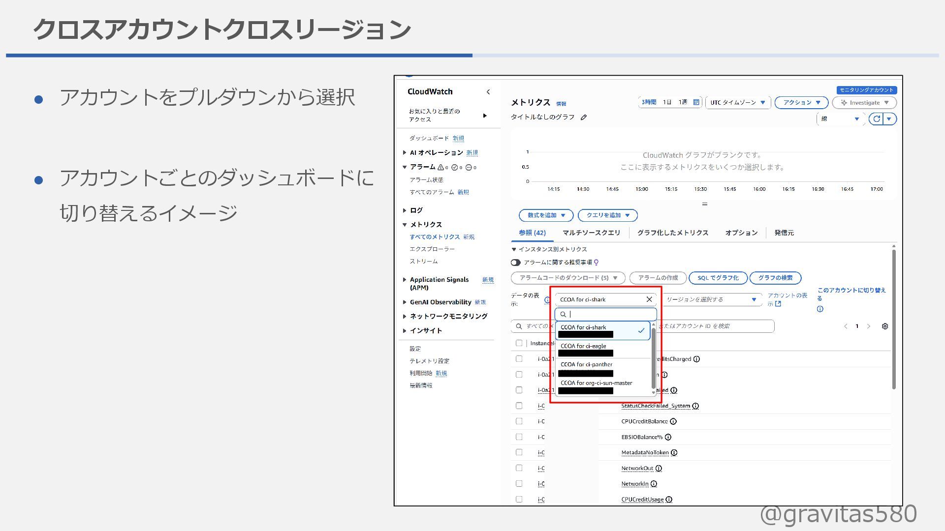 @gravitas580 クロスアカウントクロスリージョン ⚫ アカウントをプルダウンから選択 ⚫ アカウントごとのダッシュボードに 切り替えるイメージ