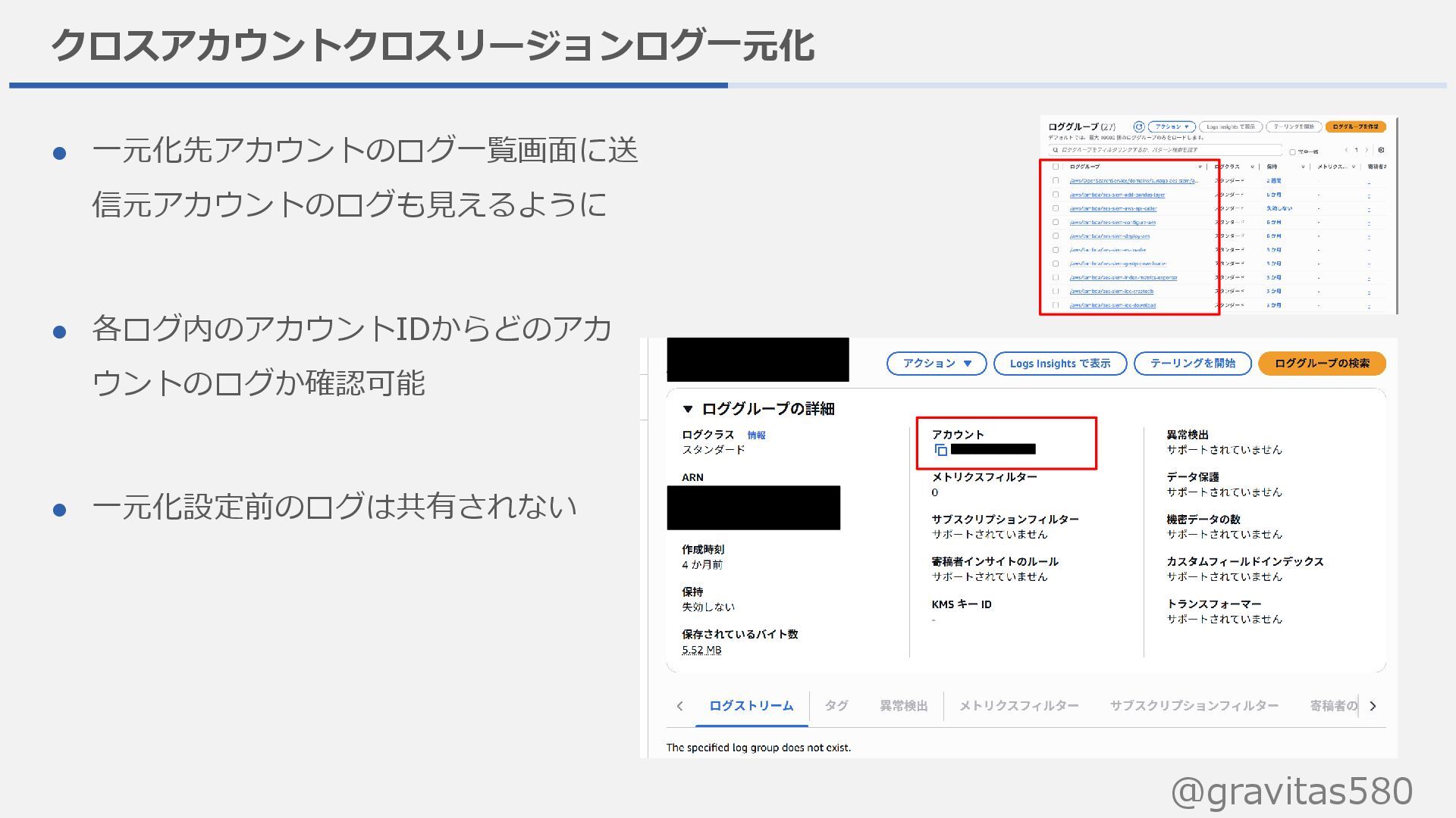 @gravitas580 クロスアカウントクロスリージョンログ一元化 ⚫ 一元化先アカウントのログ一覧画面に送 信元アカウントのログも見えるように ⚫ 各ログ内のアカウントIDからどのアカ ウントのログか確認可能 ⚫ 一元化設定前のログは共有されない