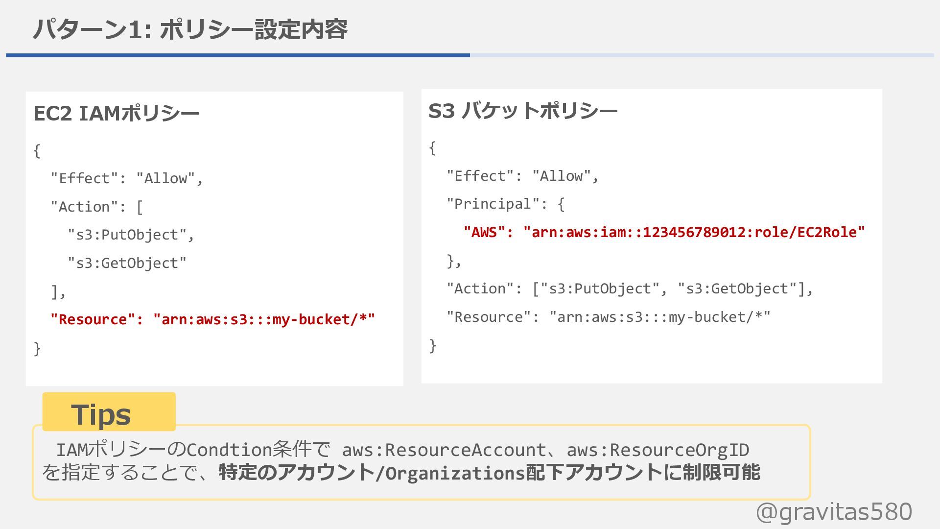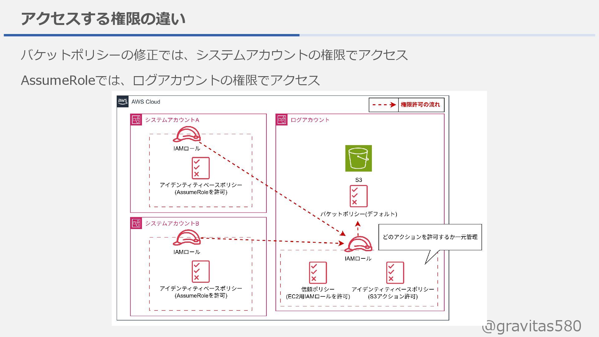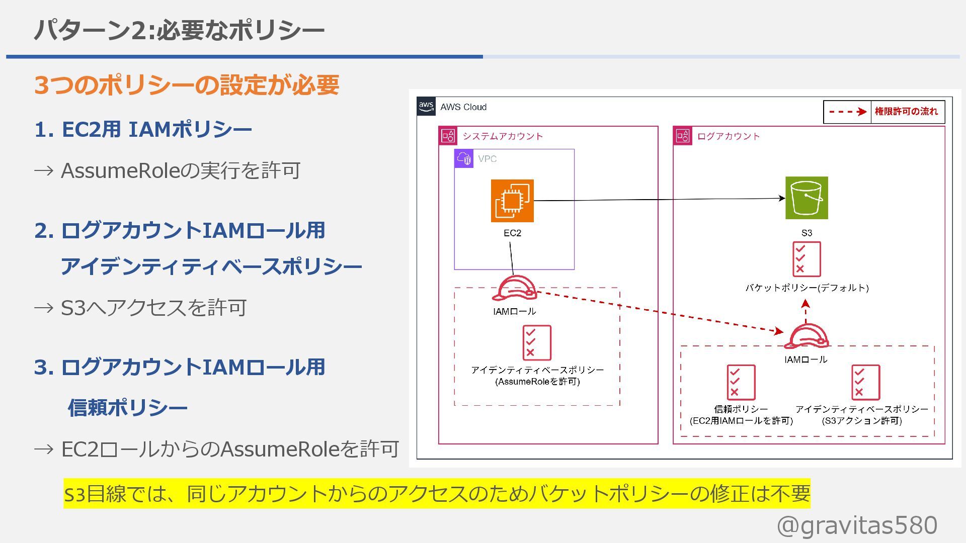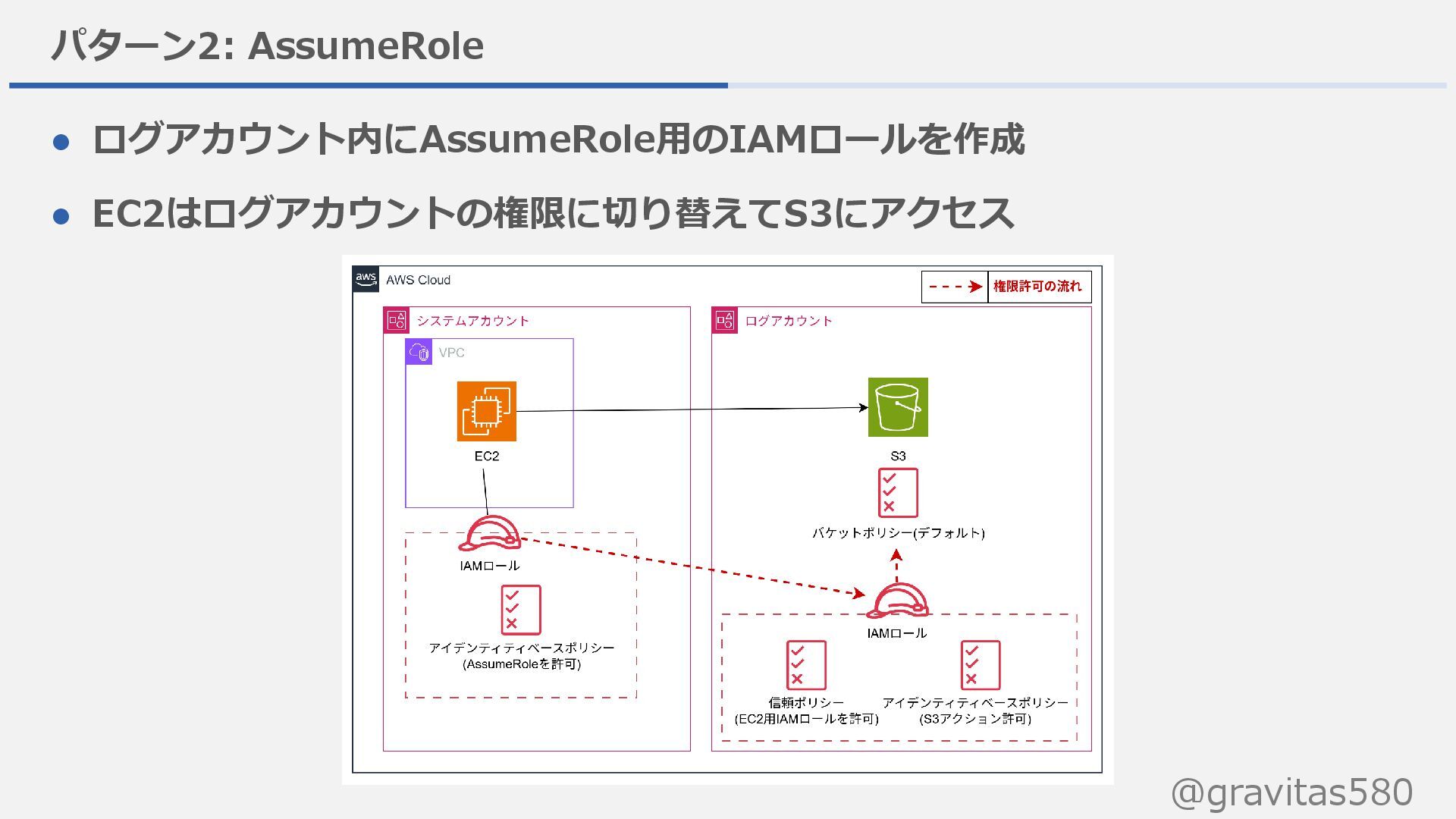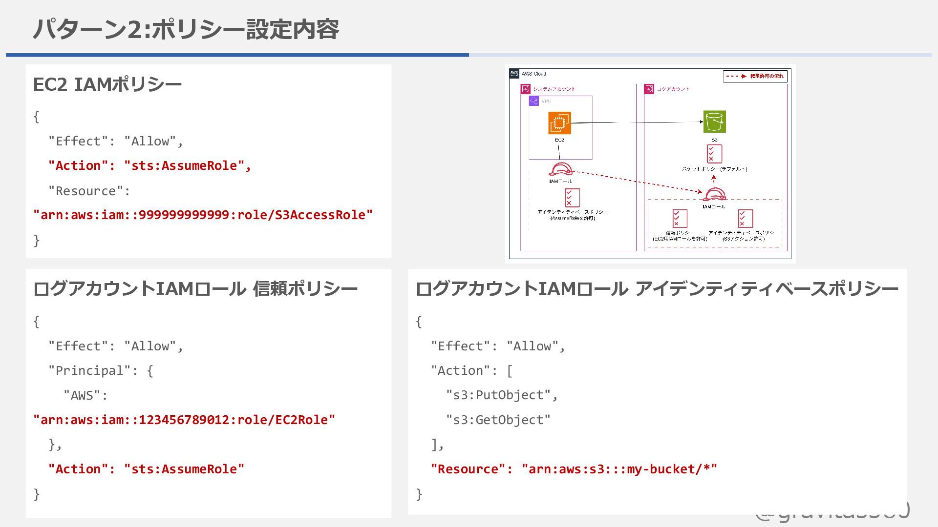 "arn:aws:iam::999999999999:role/S3AccessRole" } ログアカウントIAMロール アイデンティティベースポリシー { "Effect": "Allow", "Action": [ "s3:PutObject", "s3:GetObject" ], "Resource": "arn:aws:s3:::my-bucket/*" } ログアカウントIAMロール 信頼ポリシー { "Effect": "Allow", "Principal": { "AWS": "arn:aws:iam::123456789012:role/EC2Role" }, "Action": "sts:AssumeRole" }