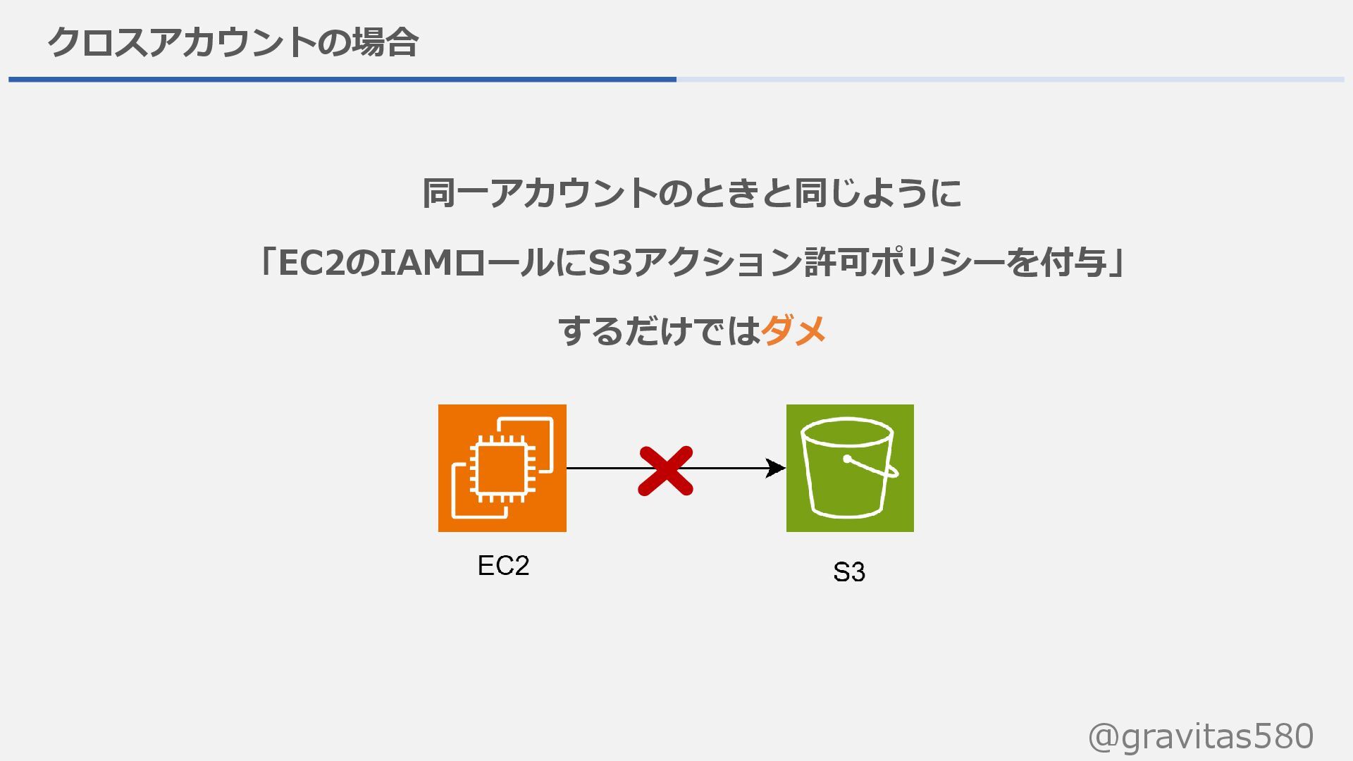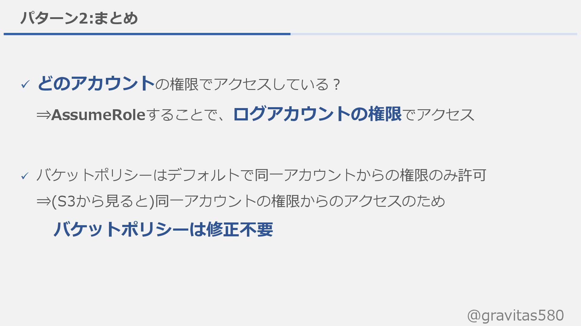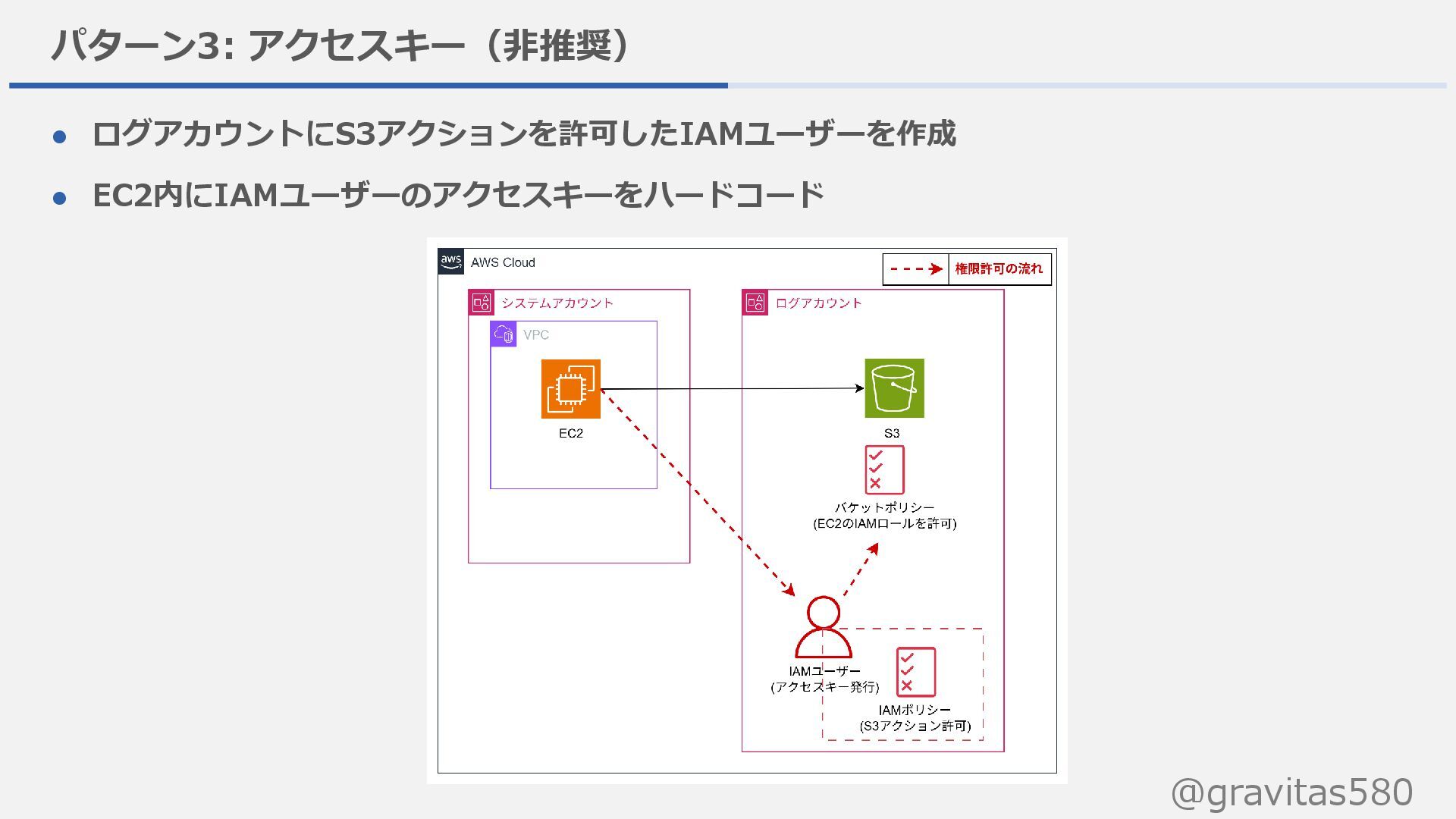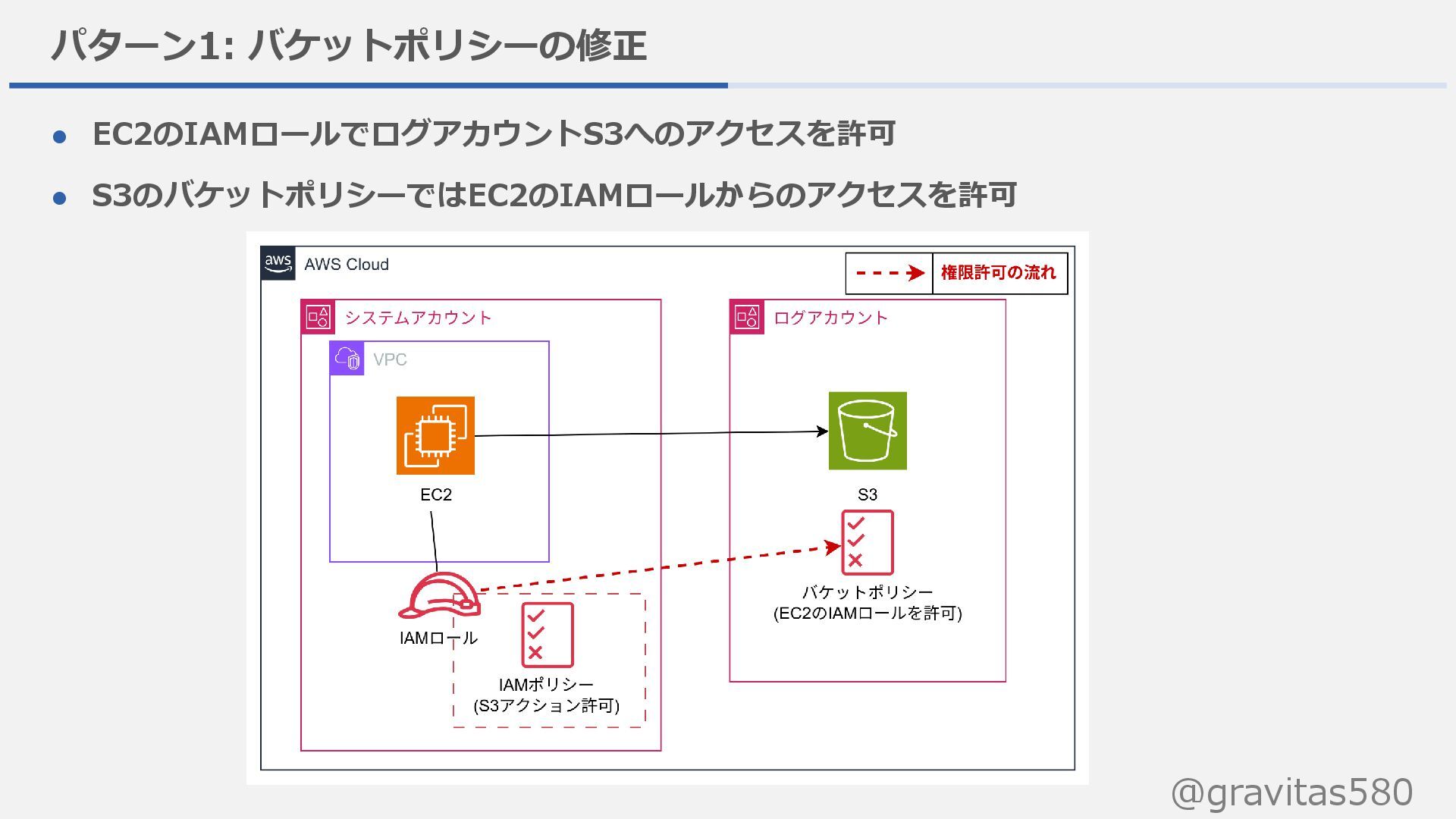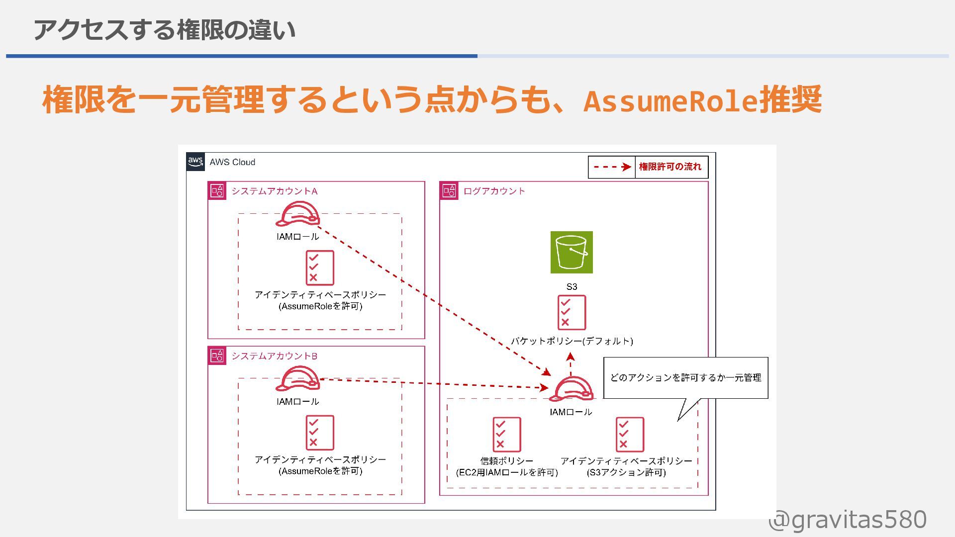 "arn:aws:iam::999999999999:role/S3AccessRole" } ログアカウントIAMロール アイデンティティベースポリシー { "Effect": "Allow", "Action": [ "s3:PutObject", "s3:GetObject" ], "Resource": "arn:aws:s3:::my-bucket/*" } ログアカウントIAMロール 信頼ポリシー { "Effect": "Allow", "Principal": { "AWS": "arn:aws:iam::123456789012:role/EC2Role" }, "Action": "sts:AssumeRole" }