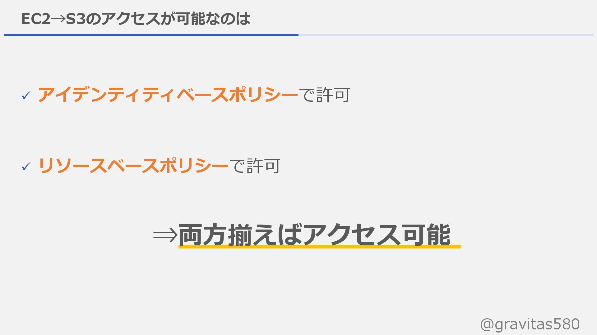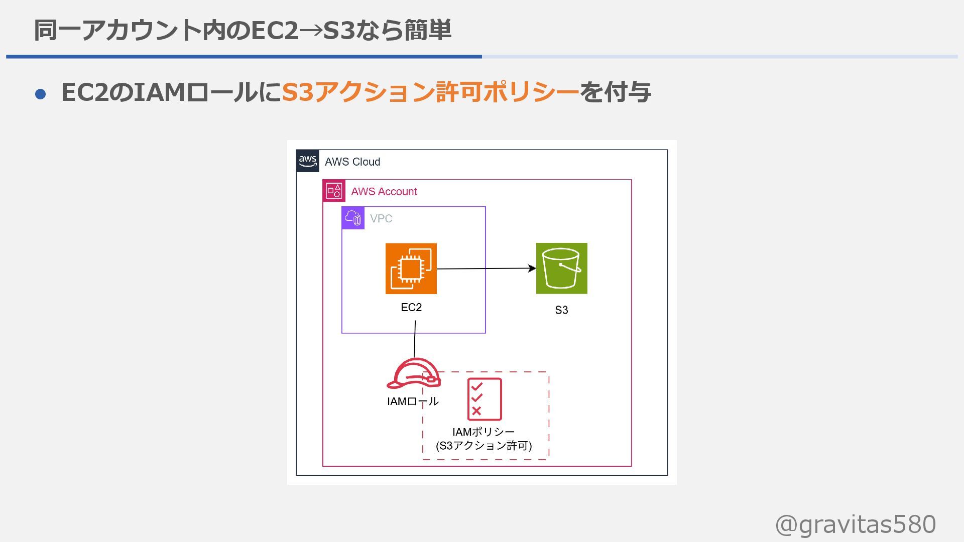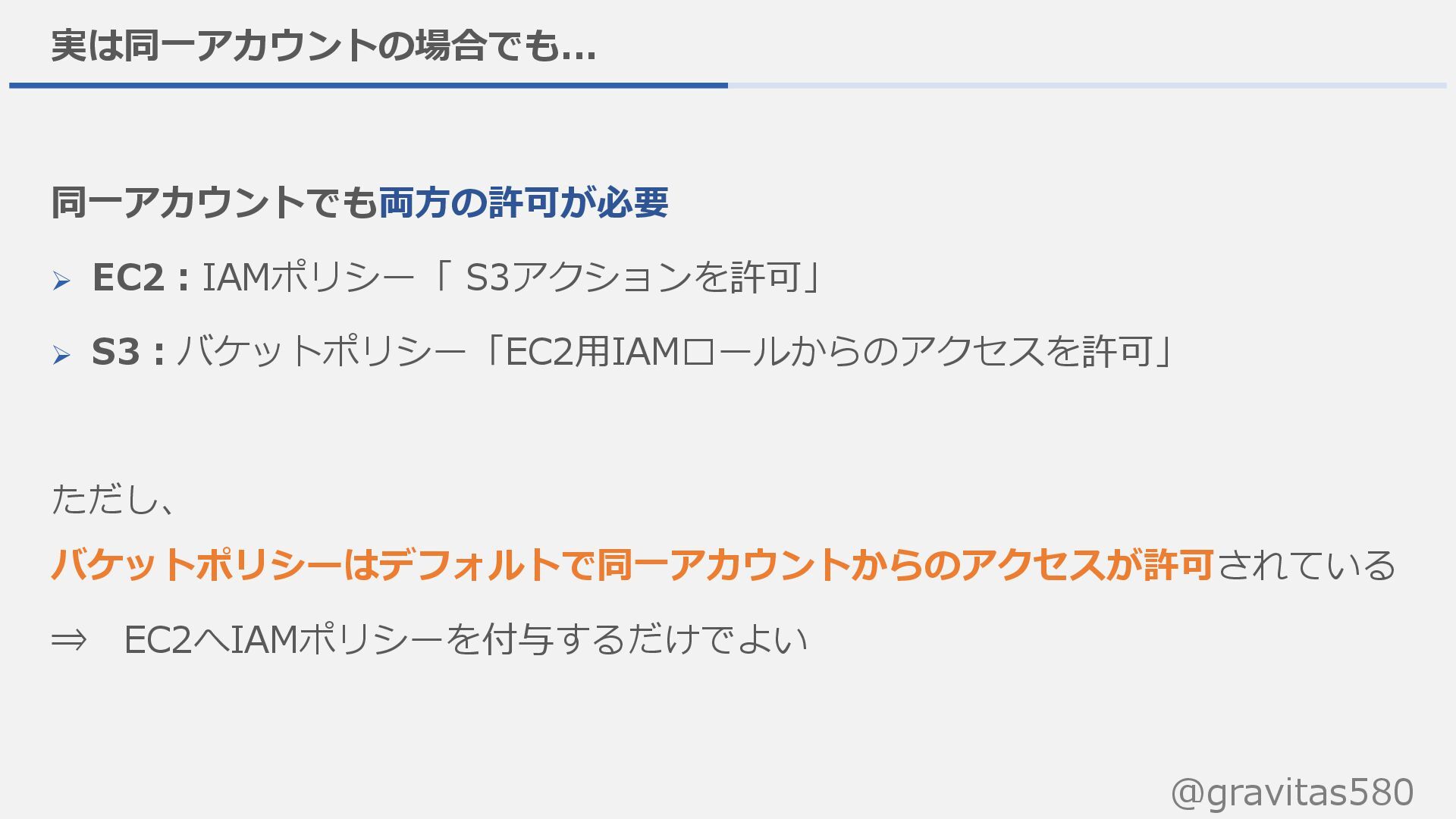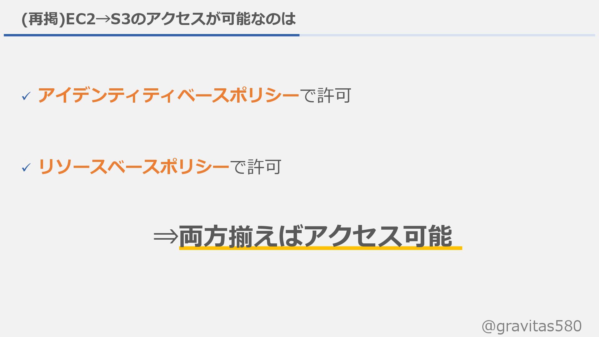 "arn:aws:iam::999999999999:role/S3AccessRole" } ログアカウントIAMロール アイデンティティベースポリシー { "Effect": "Allow", "Action": [ "s3:PutObject", "s3:GetObject" ], "Resource": "arn:aws:s3:::my-bucket/*" } ログアカウントIAMロール 信頼ポリシー { "Effect": "Allow", "Principal": { "AWS": "arn:aws:iam::123456789012:role/EC2Role" }, "Action": "sts:AssumeRole" }