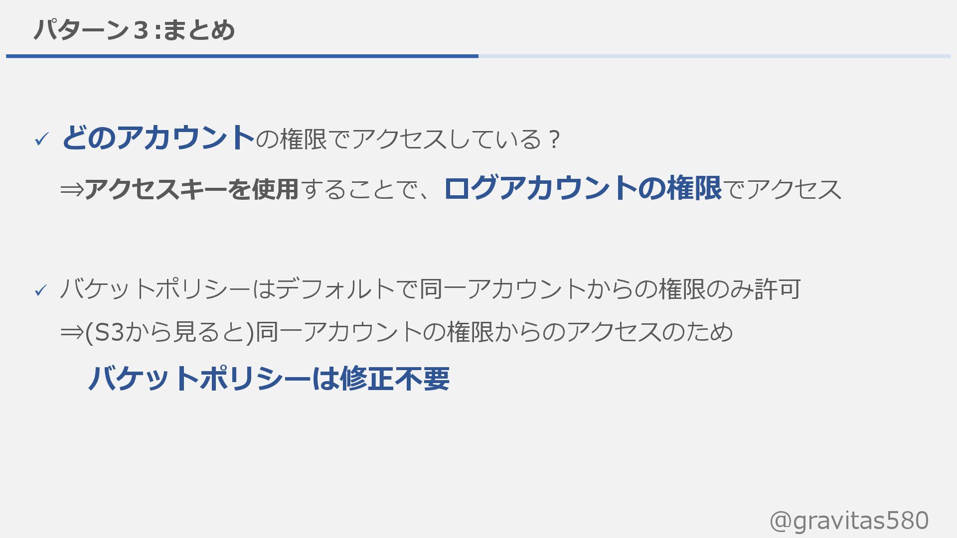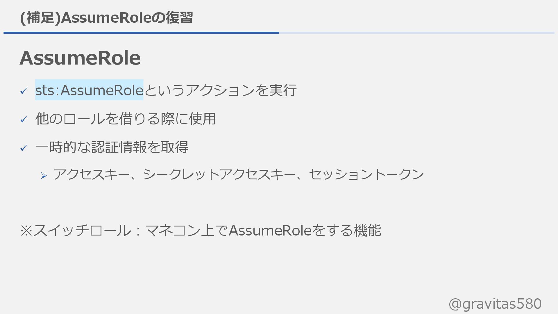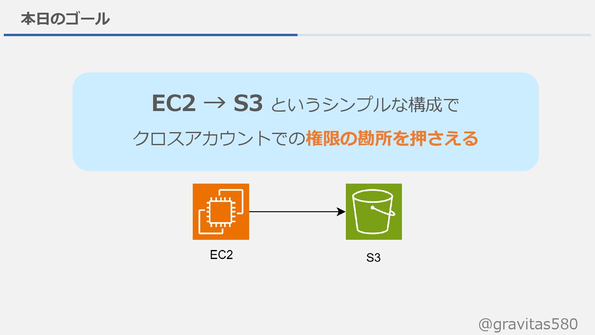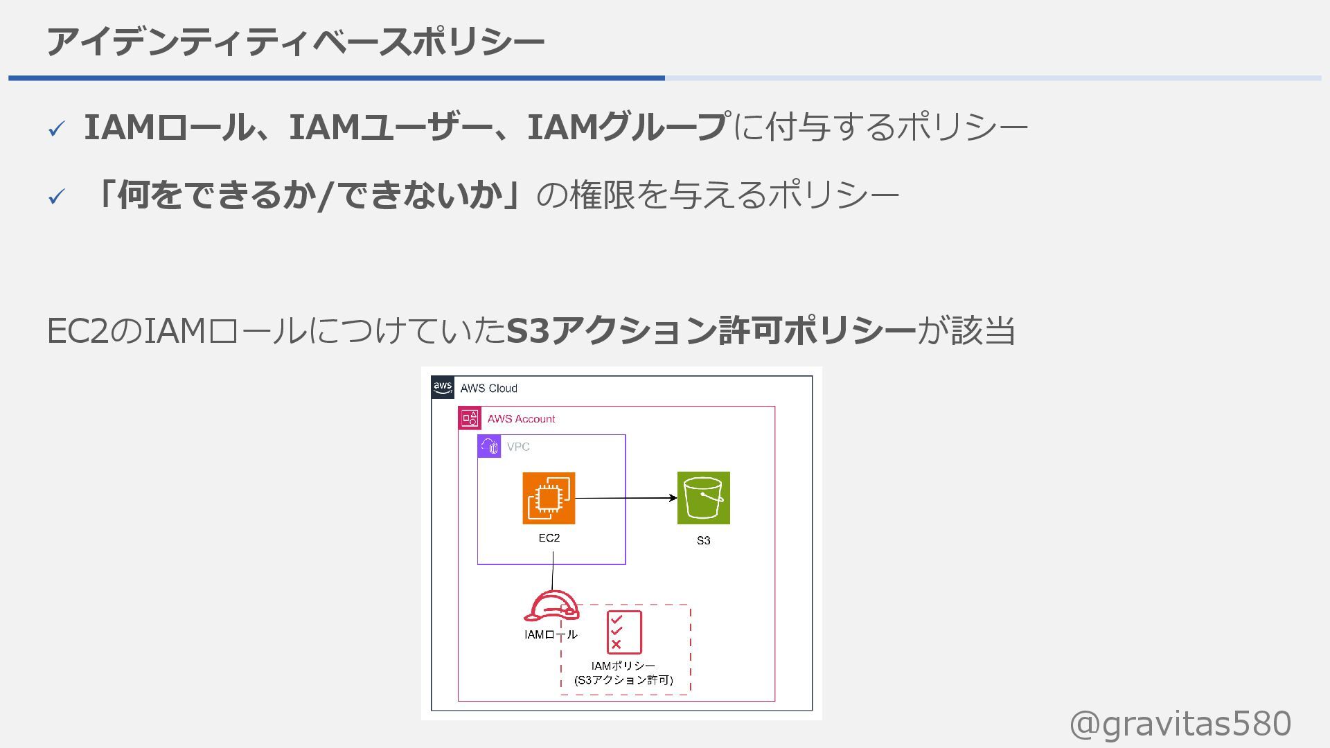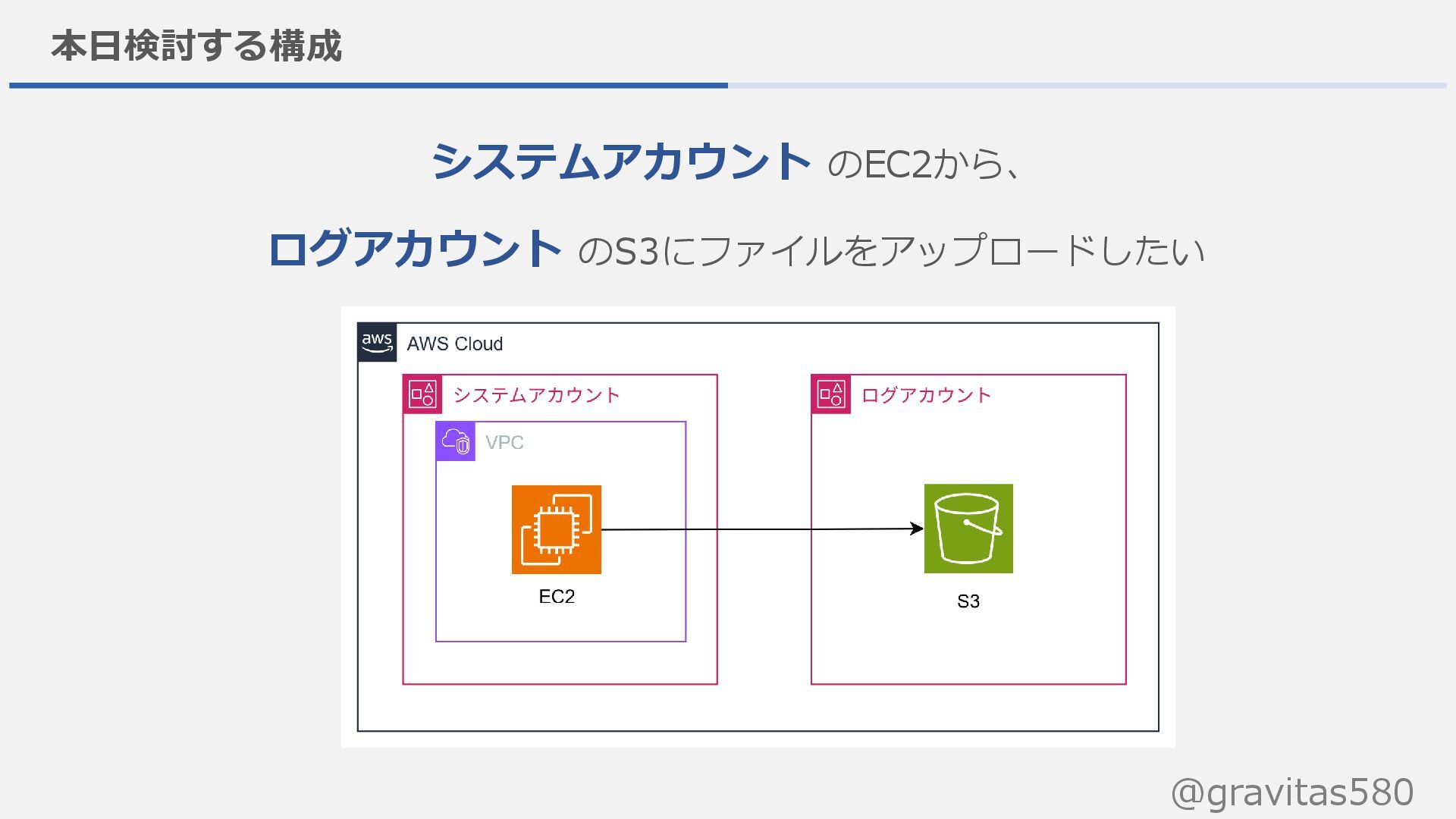 "arn:aws:iam::999999999999:role/S3AccessRole" } ログアカウントIAMロール アイデンティティベースポリシー { "Effect": "Allow", "Action": [ "s3:PutObject", "s3:GetObject" ], "Resource": "arn:aws:s3:::my-bucket/*" } ログアカウントIAMロール 信頼ポリシー { "Effect": "Allow", "Principal": { "AWS": "arn:aws:iam::123456789012:role/EC2Role" }, "Action": "sts:AssumeRole" }