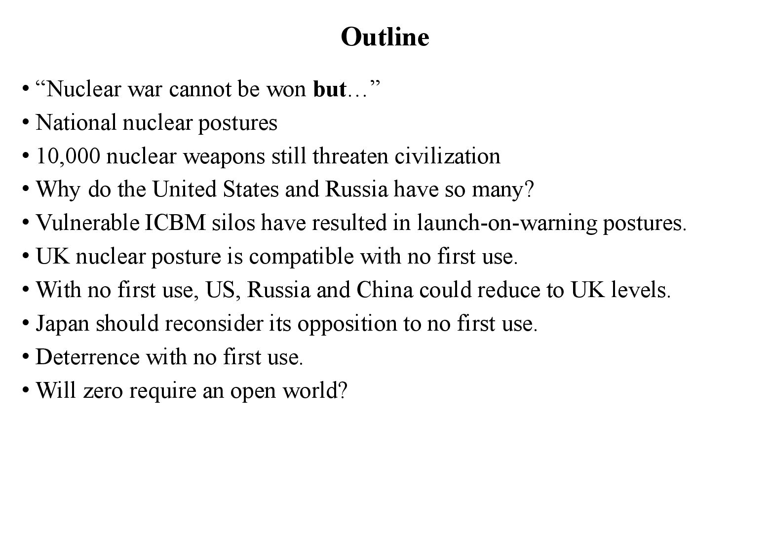 nuclear postures • 10,000 nuclear weapons still threaten civilization • Why do the United States and Russia have so many? • Vulnerable ICBM silos have resulted in launch-on-warning postures. • UK nuclear posture is compatible with no first use. • With no first use, US, Russia and China could reduce to UK levels. • Japan should reconsider its opposition to no first use. • Deterrence with no first use. • Will zero require an open world?