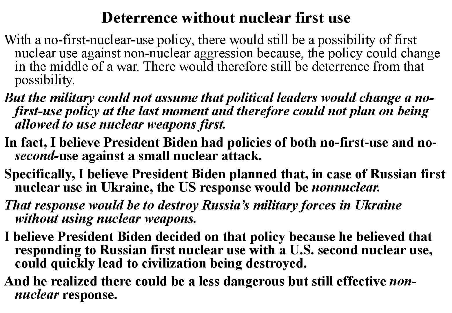 would still be a possibility of first nuclear use against non-nuclear aggression because, the policy could change in the middle of a war. There would therefore still be deterrence from that possibility. But the military could not assume that political leaders would change a no- first-use policy at the last moment and therefore could not plan on being allowed to use nuclear weapons first. In fact, I believe President Biden had policies of both no-first-use and no- second-use against a small nuclear attack. Specifically, I believe President Biden planned that, in case of Russian first nuclear use in Ukraine, the US response would be nonnuclear. That response would be to destroy Russia’s military forces in Ukraine without using nuclear weapons. I believe President Biden decided on that policy because he believed that responding to Russian first nuclear use with a U.S. second nuclear use, could quickly lead to civilization being destroyed. And he realized there could be a less dangerous but still effective non- nuclear response.