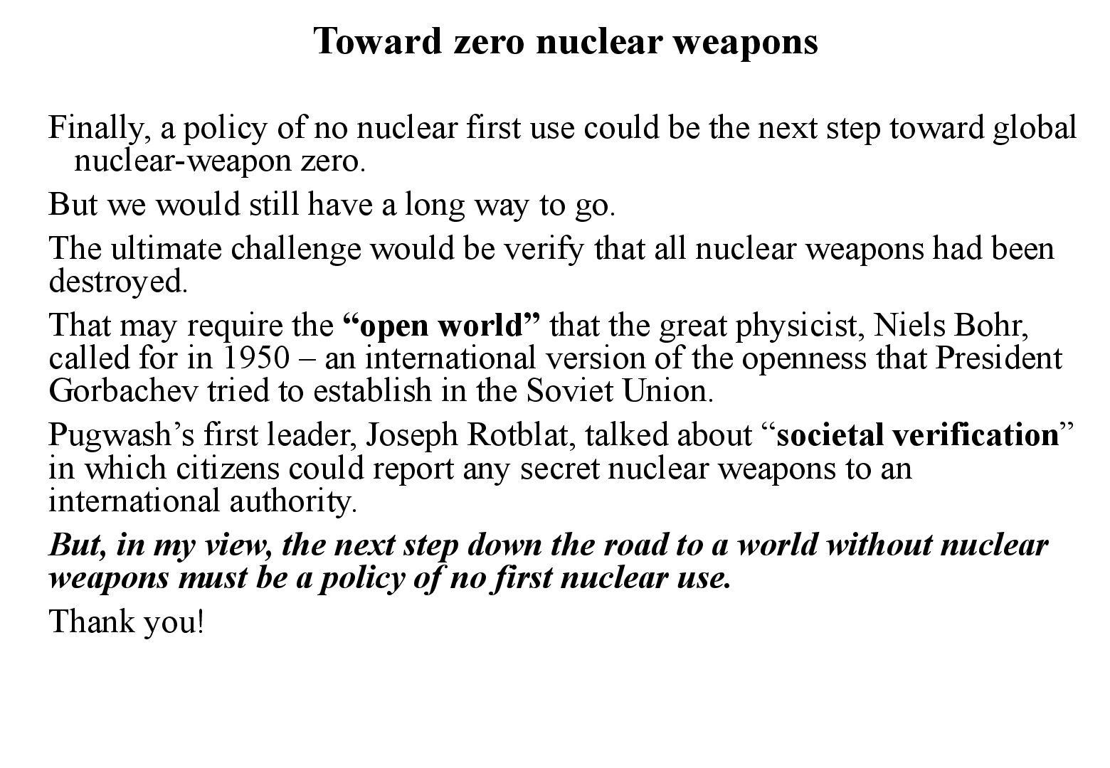 first use could be the next step toward global nuclear-weapon zero. But we would still have a long way to go. The ultimate challenge would be to verify that all nuclear weapons had been destroyed. That may require the “open world” that the great physicist, Niels Bohr, called for in 1950 – an international version of the openness that President Gorbachev tried to establish in the Soviet Union. Pugwash’s first leader, Joseph Rotblat, talked about “societal verification” in which citizens could report any secret nuclear weapons to an international authority. But, in my view, the next step down the road to a world without nuclear weapons must be a policy of no first nuclear use. Thank you!