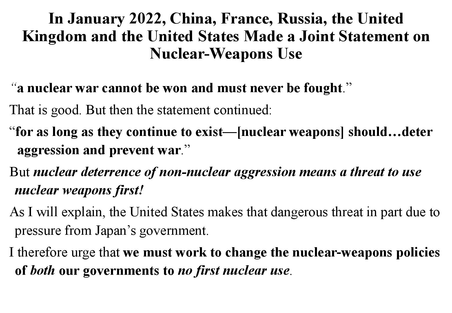 the United States Made a Joint Statement on Nuclear-Weapons Use “a nuclear war cannot be won and must never be fought.” That is good. But then the statement continued: “for as long as they continue to exist—[nuclear weapons] should…deter aggression and prevent war.” But nuclear deterrence of non-nuclear aggression means a threat to use nuclear weapons first! As I will explain, the United States makes that dangerous threat in part due to pressure from Japan’s government. I therefore urge that we must work to change the nuclear-weapons policies of both our governments to no first nuclear use.