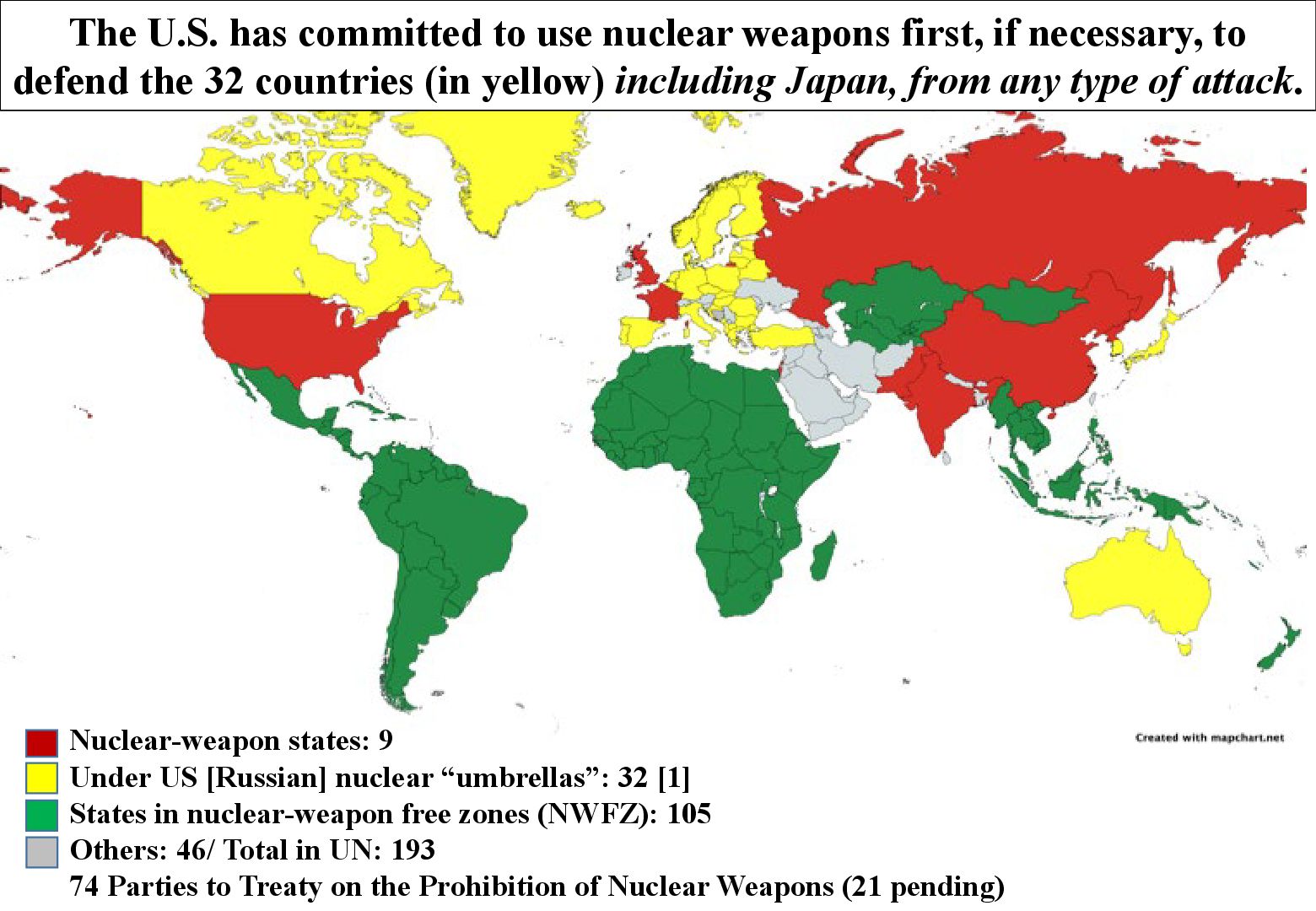 necessary, to defend the 32 countries (in yellow) including Japan, from any type of attack. Nuclear-weapon states: 9 Under US [Russian] nuclear “umbrellas”: 32 [1] States in nuclear-weapon free zones (NWFZ): 105 Others: 46/ Total in UN: 193 74 Parties to Treaty on the Prohibition of Nuclear Weapons (21 pending)