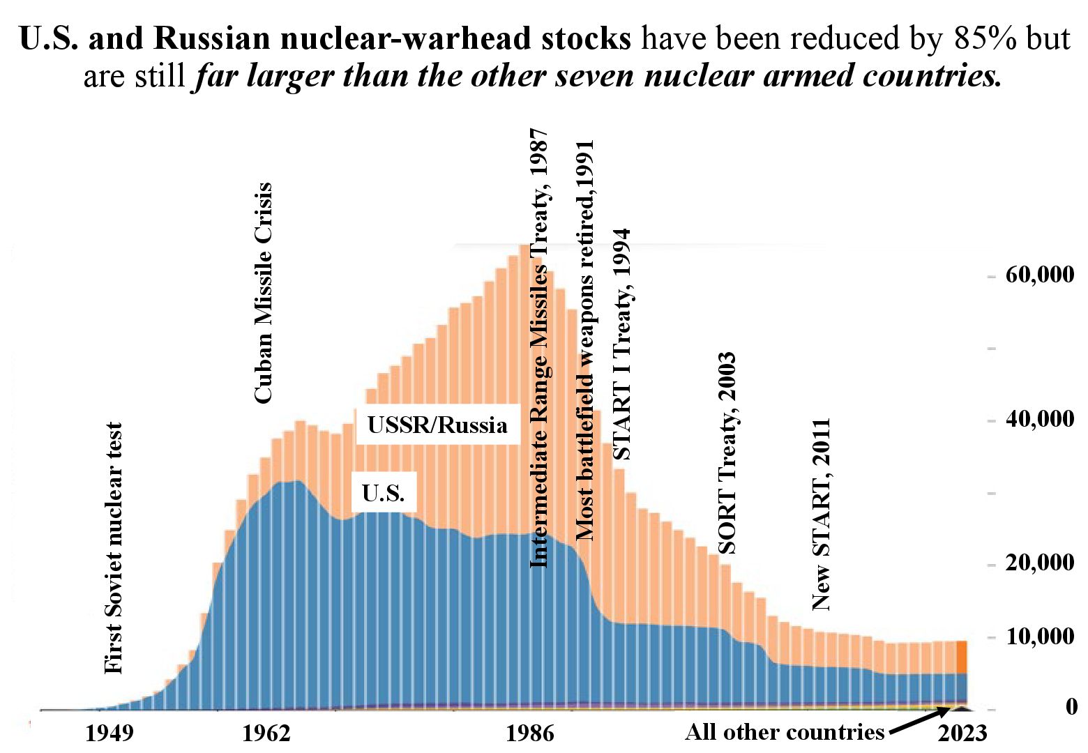 but are still far larger than the other seven nuclear armed countries. C Cuban Missile Crisis Intermediate Range Missiles Treaty, 1987 First Soviet nuclear test 60,000 40,000 20,000 10,000 0 1949 1962 1986 2023 U.S. USSR/Russia All other countries Most battlefield weapons retired,1991 START I Treaty, 1994 SORT Treaty, 2003 New START, 2011
