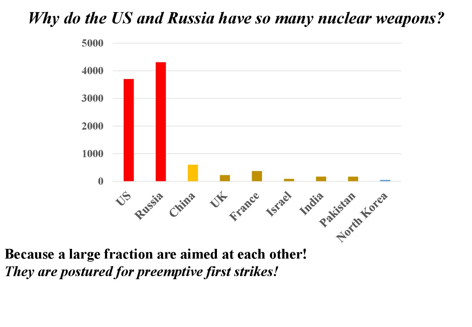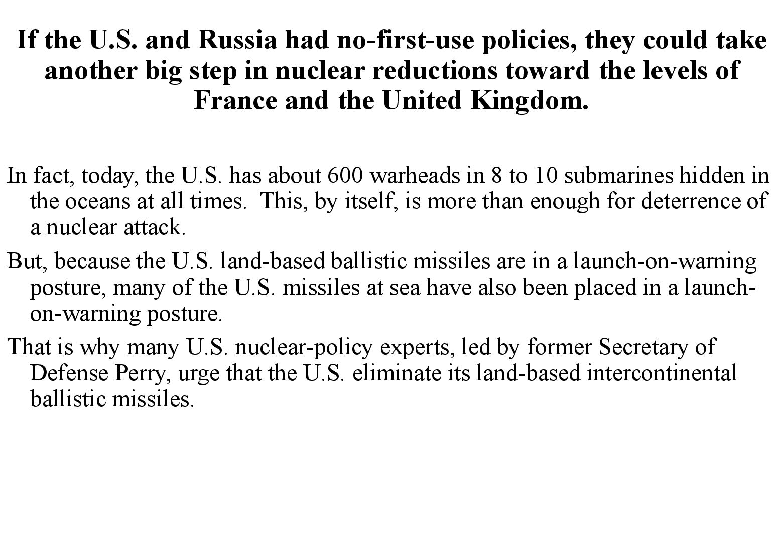 take another big step in nuclear reductions toward the levels of France and the United Kingdom. In fact, today, the U.S. has about 600 warheads in 8 to 10 submarines hidden in the oceans at all times. This, by itself, is more than enough for deterrence of a nuclear attack. But, because the U.S. land-based ballistic missiles are in a launch-on-warning posture, many of the U.S. missiles at sea have also been placed in a launch- on-warning posture. That is why many U.S. nuclear-policy experts, led by former Secretary of Defense Perry, urge that the U.S. eliminate its land-based intercontinental ballistic missiles.