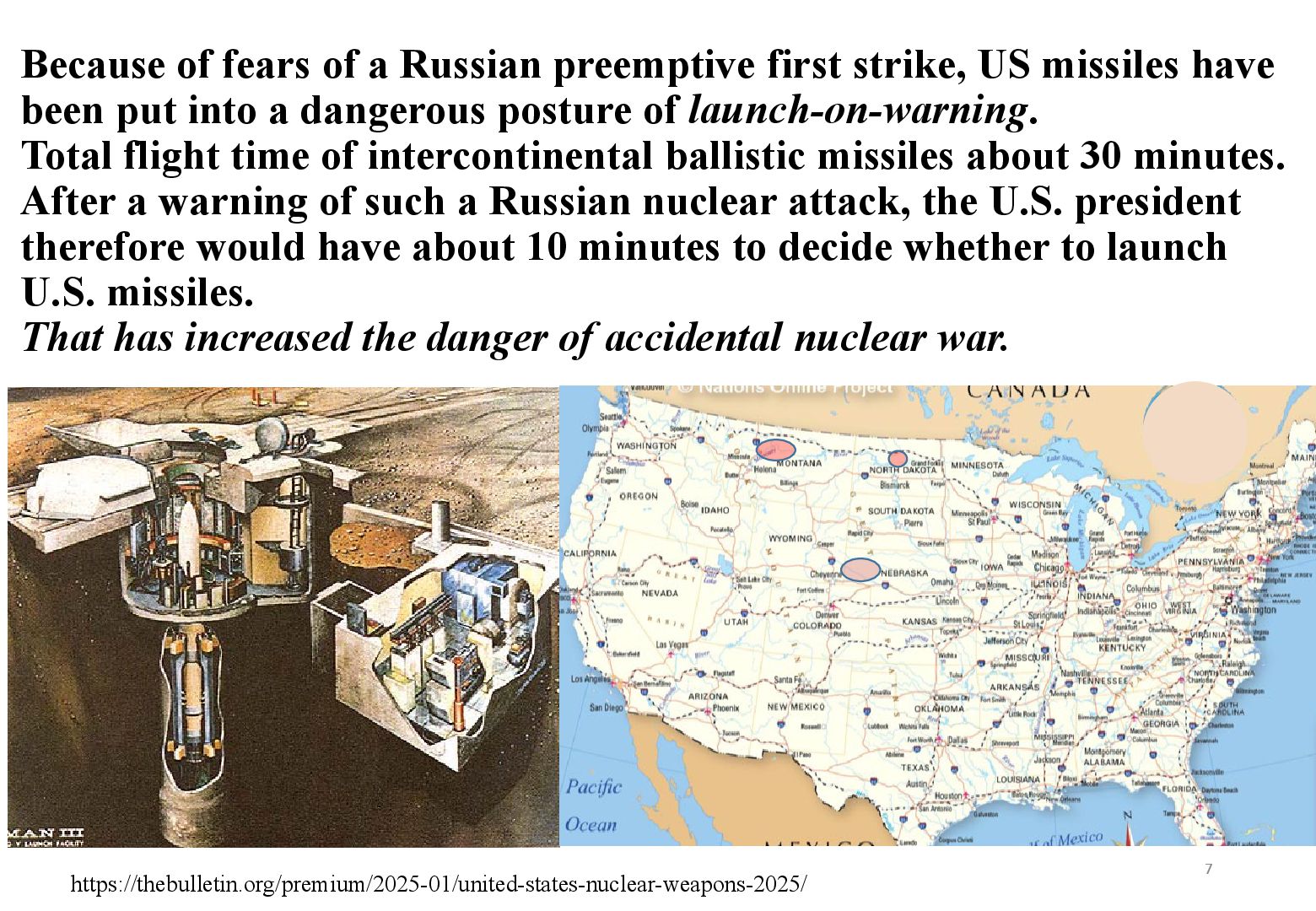 missiles have been put into a dangerous posture of launch-on-warning. Total flight time of intercontinental ballistic missiles about 30 minutes. After a warning of such a Russian nuclear attack, the U.S. president therefore would have about 10 minutes to decide whether to launch U.S. missiles. That has increased the danger of accidental nuclear war. Russia’s ballistic missiles can reach US ICBM silos with ≤ 30 min. flight time. President’s decision time less than 10 minutes. 65,000 warheads 7 https://thebulletin.org/premium/2025-01/united-states-nuclear-weapons-2025/