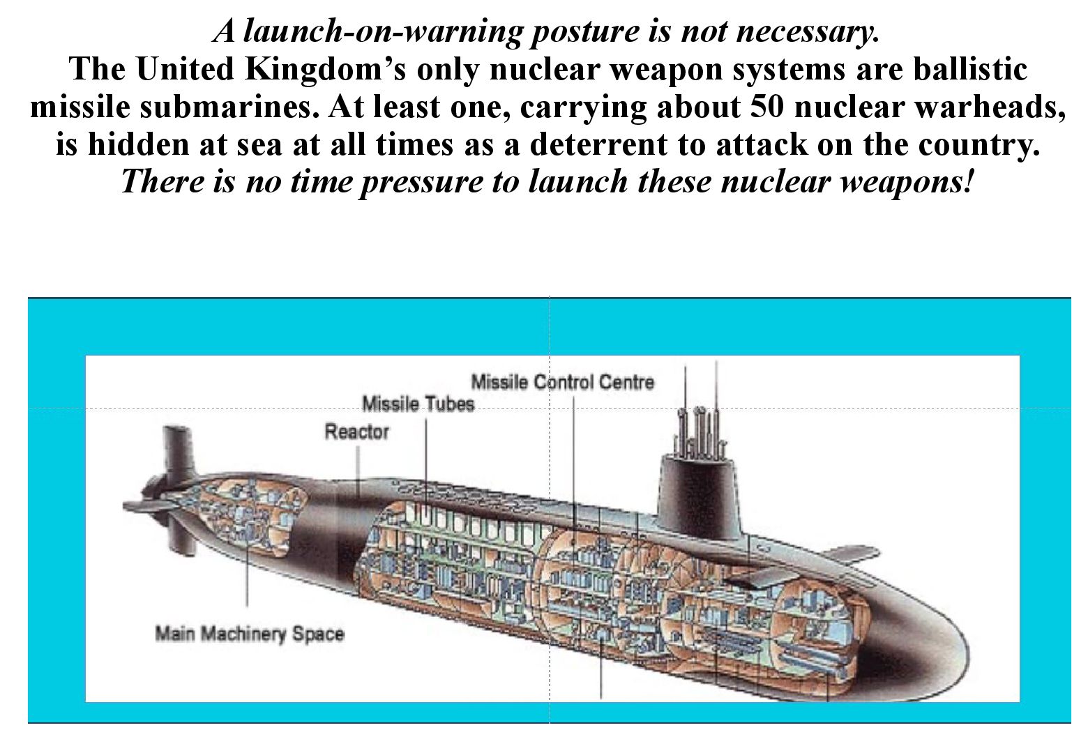 nuclear weapon systems are ballistic missile submarines. At least one, carrying about 50 nuclear warheads, is hidden at sea at all times as a deterrent to attack on the country. There is no time pressure to launch these nuclear weapons!