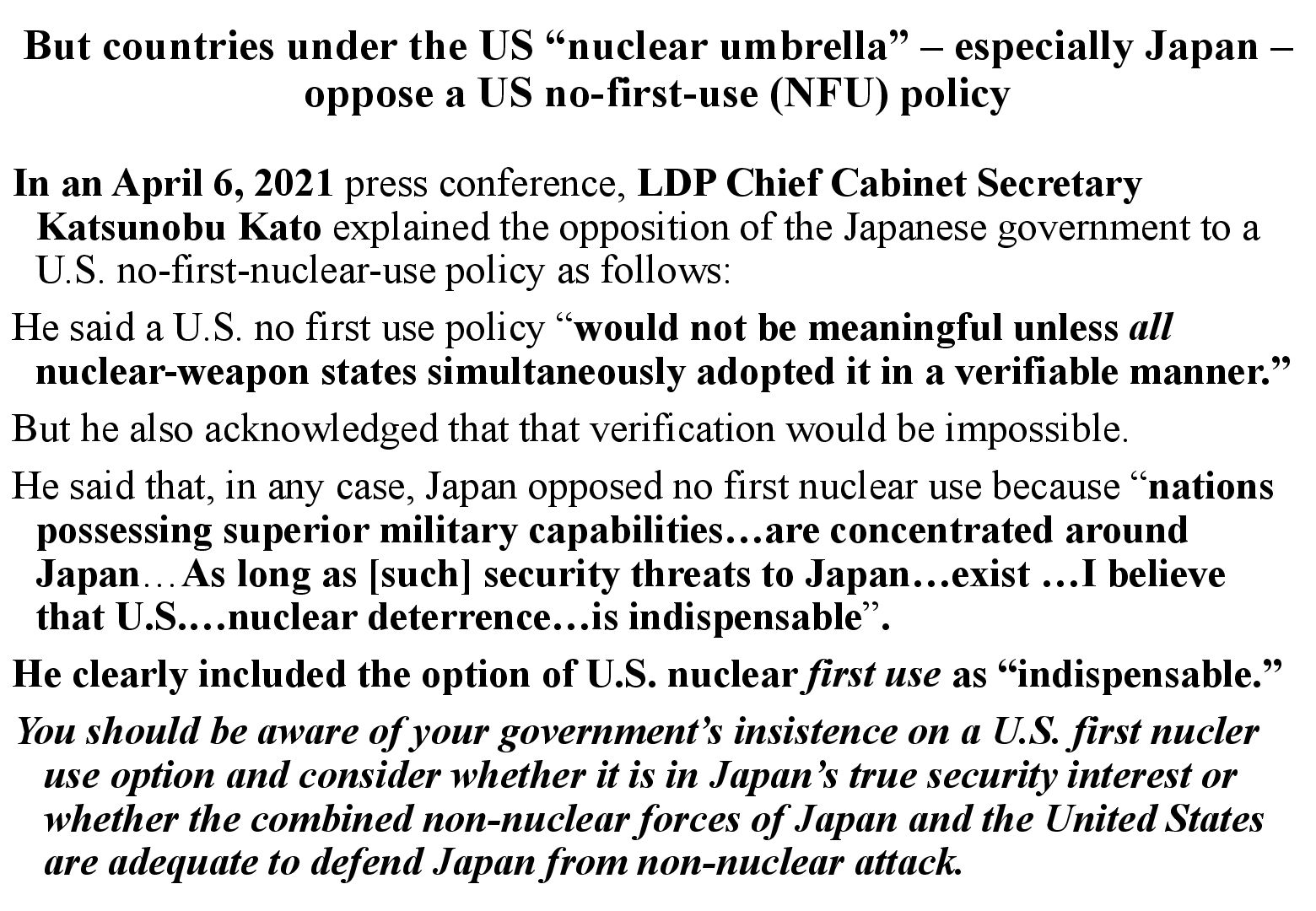 – oppose a US no-first-use (NFU) policy In an April 6, 2021 press conference, LDP Chief Cabinet Secretary Katsunobu Kato explained the opposition of the Japanese government to a U.S. no-first-nuclear-use policy as follows: He said a U.S. no first use policy “would not be meaningful unless all nuclear-weapon states simultaneously adopted it in a verifiable manner.” But he also acknowledged that that verification would be impossible. He said that, in any case, Japan opposed no first nuclear use because “nations possessing superior military capabilities…are concentrated around Japan…As long as [such] security threats to Japan…exist …I believe that U.S.…nuclear deterrence…is indispensable”. He clearly included the option of U.S. nuclear first use as “indispensable.” You should be aware of your government’s insistence on a U.S. first nuclear use option and consider whether it is in Japan’s true security interest or whether the combined non-nuclear forces of Japan and the United States are adequate to defend Japan from non-nuclear attack.