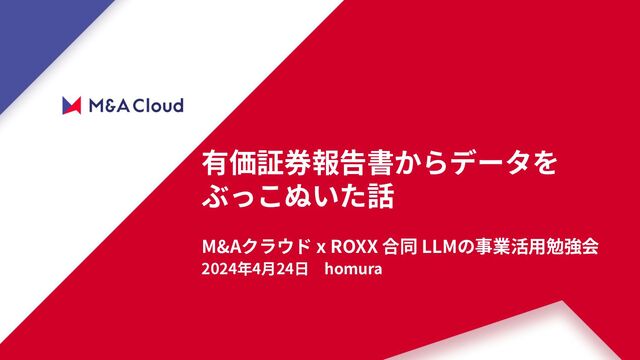 Copyright© M&Aクラウド 有価証券報告書からデータを ぶっこぬいた話 M&Aクラウド x ROXX 合同 LLMの事業活⽤勉強会 2024年4⽉24⽇ homura