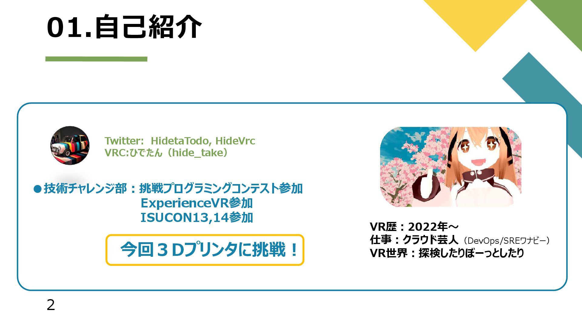 01.自己紹介 2 Twitter: HidetaTodo, HideVrc VRC:ひでたん(hide_take) •技術チャレンジ部:挑戦プログラミングコンテスト参加 ExperienceVR参加 ISUCON13,14参加 今回3Dプリンタに挑戦! VR歴:2022年~