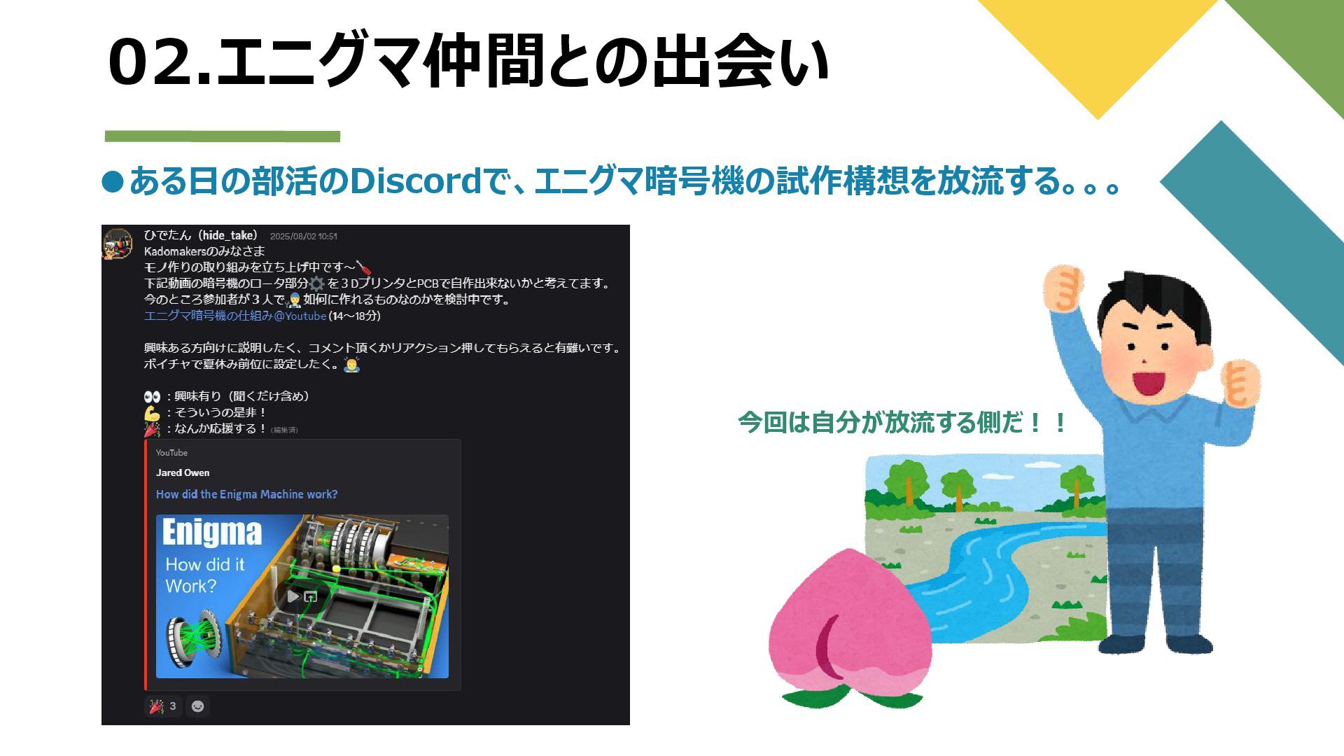 02.エニグマ仲間との出会い 3 •ある日の部活のDiscordで、エニグマ暗号機の試作構想を放流する。。。 今回は自分が放流する側だ!!