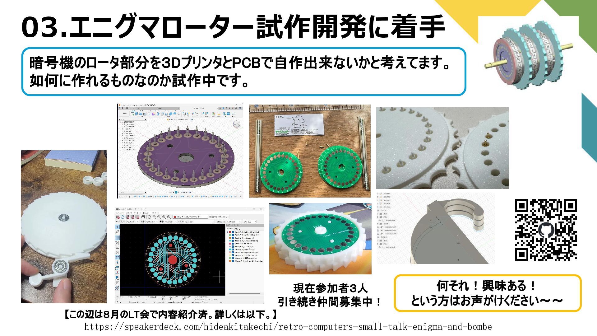 03.エニグマローター試作開発に着手 Colossus 何それ!興味ある! という方はお声がけください~~ 暗号機のロータ部分を3DプリンタとPCBで自作出来ないかと考えてます。 如何に作れるものなのか試作中です。 現在参加者3人 引き続き仲間募集中! なかなか難しい 【この辺は8月のLT会で内容紹介済。詳しくは以下。】