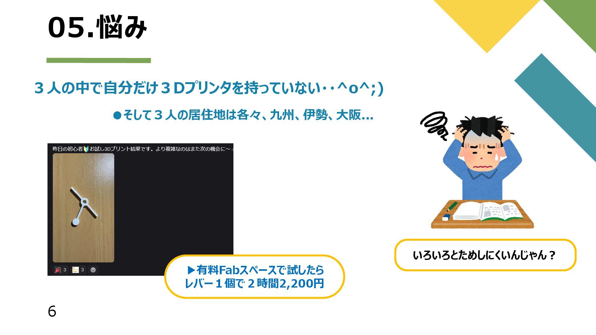 6 05.悩み いろいろとためしにくいんじゃん? 3人の中で自分だけ3Dプリンタを持っていない・・^o^;) •そして3人の居住地は各々、九州、伊勢、大阪... ▶有料Fabスペースで試したら レバー1個で2時間2,200円