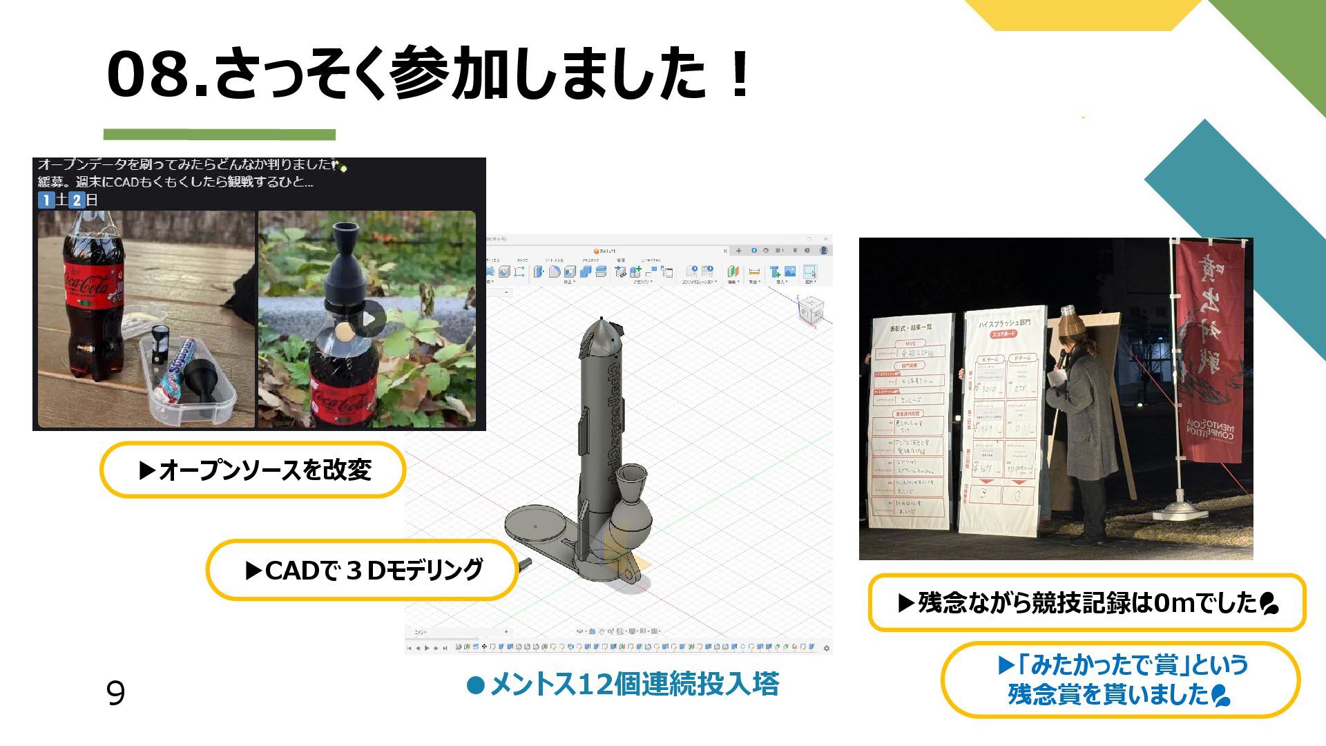 9 08.さっそく参加しました! ▶残念ながら競技記録は0mでした ▶「みたかったで賞」という 残念賞を貰いました ▶CADで3Dモデリング •メントス12個連続投入塔 ▶オープンソースを改変