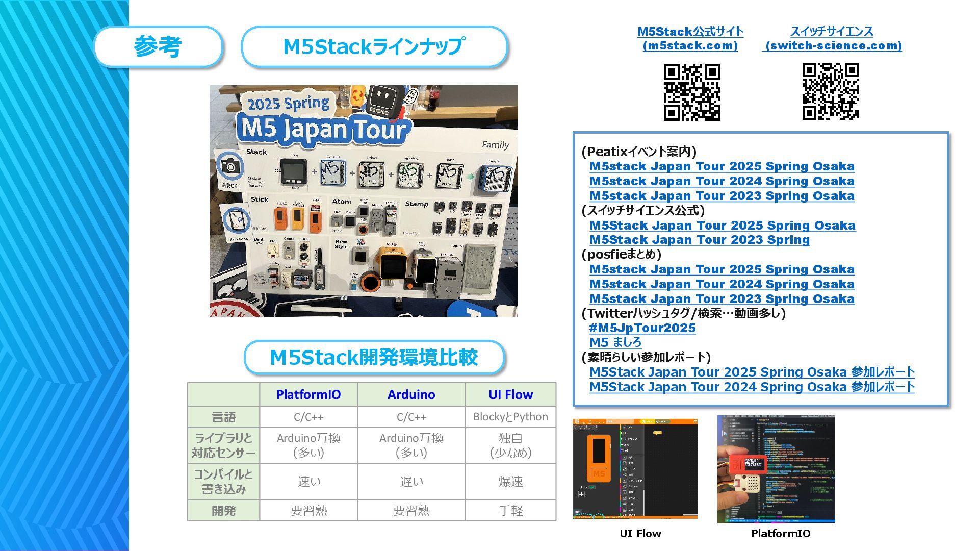 2024 Spring Osaka M5stack Japan Tour 2023 Spring Osaka (スイッチサイエンス公式) M5Stack Japan Tour 2025 Spring Osaka M5Stack Japan Tour 2023 Spring (posfieまとめ) M5stack Japan Tour 2025 Spring Osaka M5stack Japan Tour 2024 Spring Osaka M5stack Japan Tour 2023 Spring Osaka (Twitterハッシュタグ/検索…動画多し) #M5JpTour2025 M5 ましろ (素晴らしい参加レポート) M5Stack Japan Tour 2025 Spring Osaka 参加レポート M5Stack Japan Tour 2024 Spring Osaka 参加レポート PlatformIO Arduino UI Flow 言語 C/C++ C/C++ BlockyとPython ライブラリと 対応センサー Arduino互換 (多い) Arduino互換 (多い) 独自 (少なめ) コンパイルと 書き込み 速い 遅い 爆速 開発 要習熟 要習熟 手軽 UI Flow PlatformIO スイッチサイエンス (switch-science.com) M5Stack公式サイト (m5stack.com) M5Stackラインナップ M5Stack開発環境比較 参考