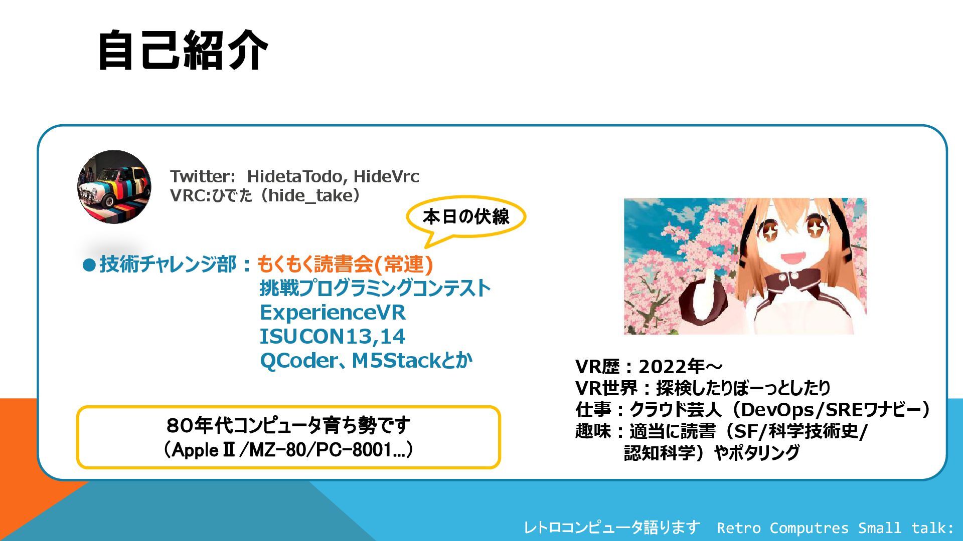 Twitter: HidetaTodo, HideVrc VRC:ひでた(hide_take) •技術チャレンジ部:もくもく読書会(常連) 挑戦プログラミングコンテスト ExperienceVR ISUCON13,14 QCoder、M5Stackとか 80年代コンピュータ育ち勢です (AppleⅡ/MZ-80/PC-8001...) VR歴:2022年~ VR世界:探検したりぼーっとしたり 仕事:クラウド芸人(DevOps/SREワナビー) 趣味:適当に読書(SF/科学技術史/ 認知科学)やポタリング 自己紹介 本日の伏線