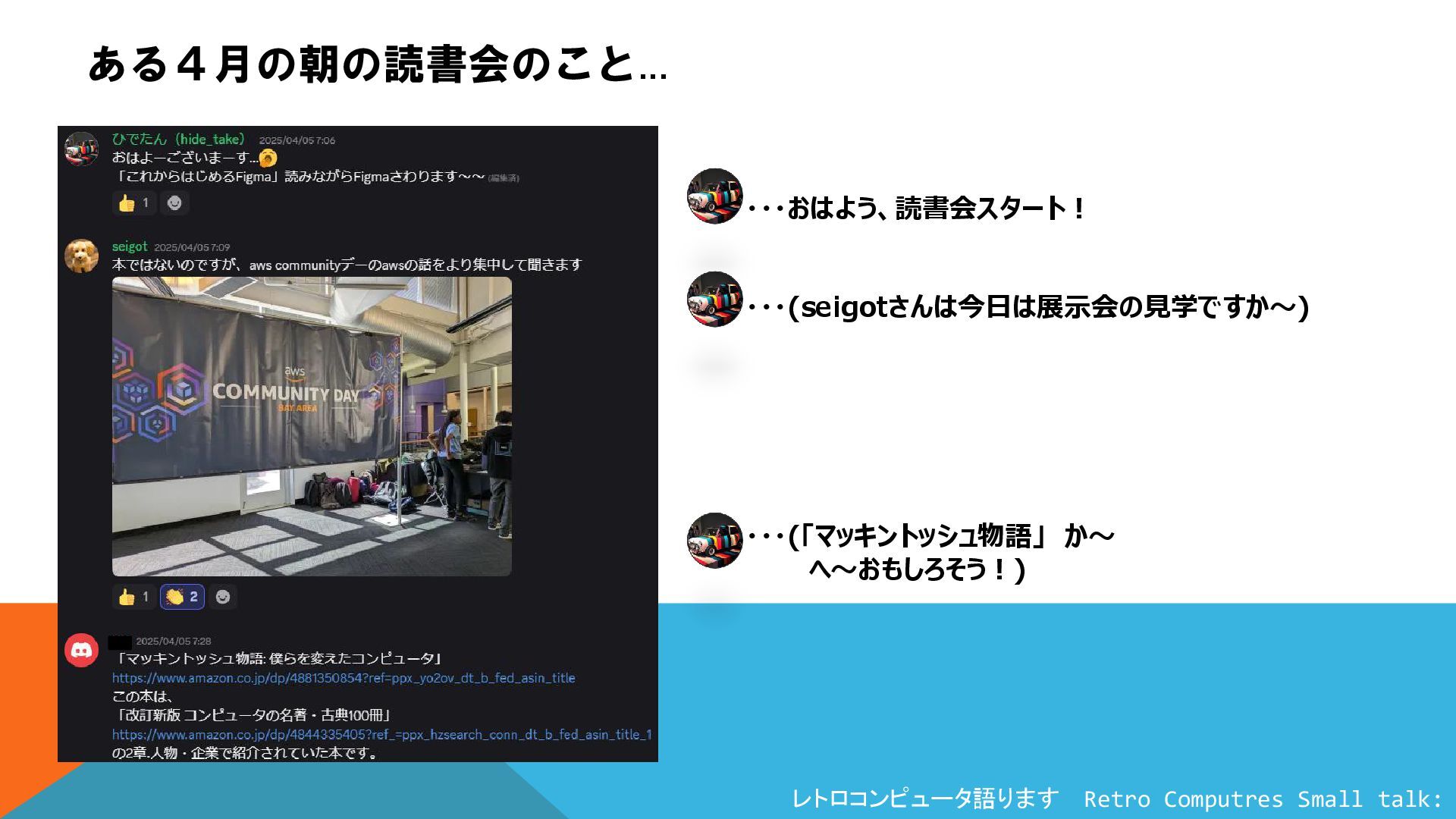 レトロコンピュータ語ります Retro Computres Small talk: ・・・おはよう、読書会スタート! ・・・(seigotさんは今日は展示会の見学ですか~) ・・・(「マッキントッシュ物語」 か~ へ~おもしろそう!)