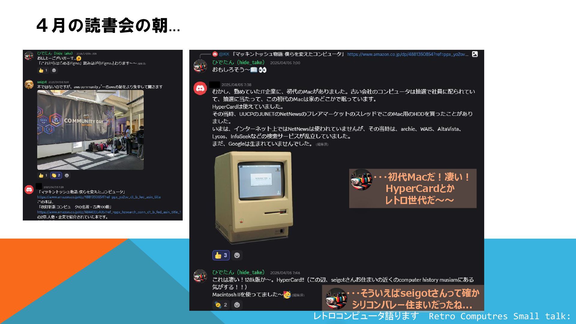 レトロコンピュータ語ります Retro Computres Small talk: 4月の読書会の朝… ・・・初代Macだ!凄い! HyperCardとか レトロ世代だ~~ ・・・そういえばseigotさんって確か