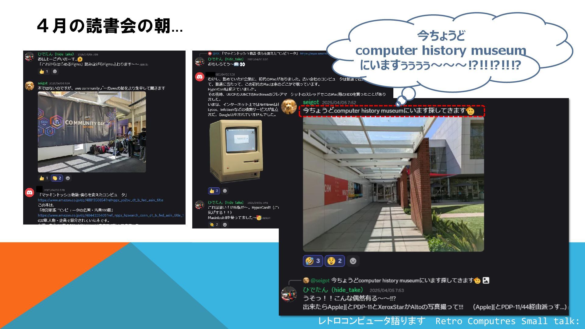 レトロコンピュータ語ります Retro Computres Small talk: 4月の読書会の朝… 今ちょうど computer history museum