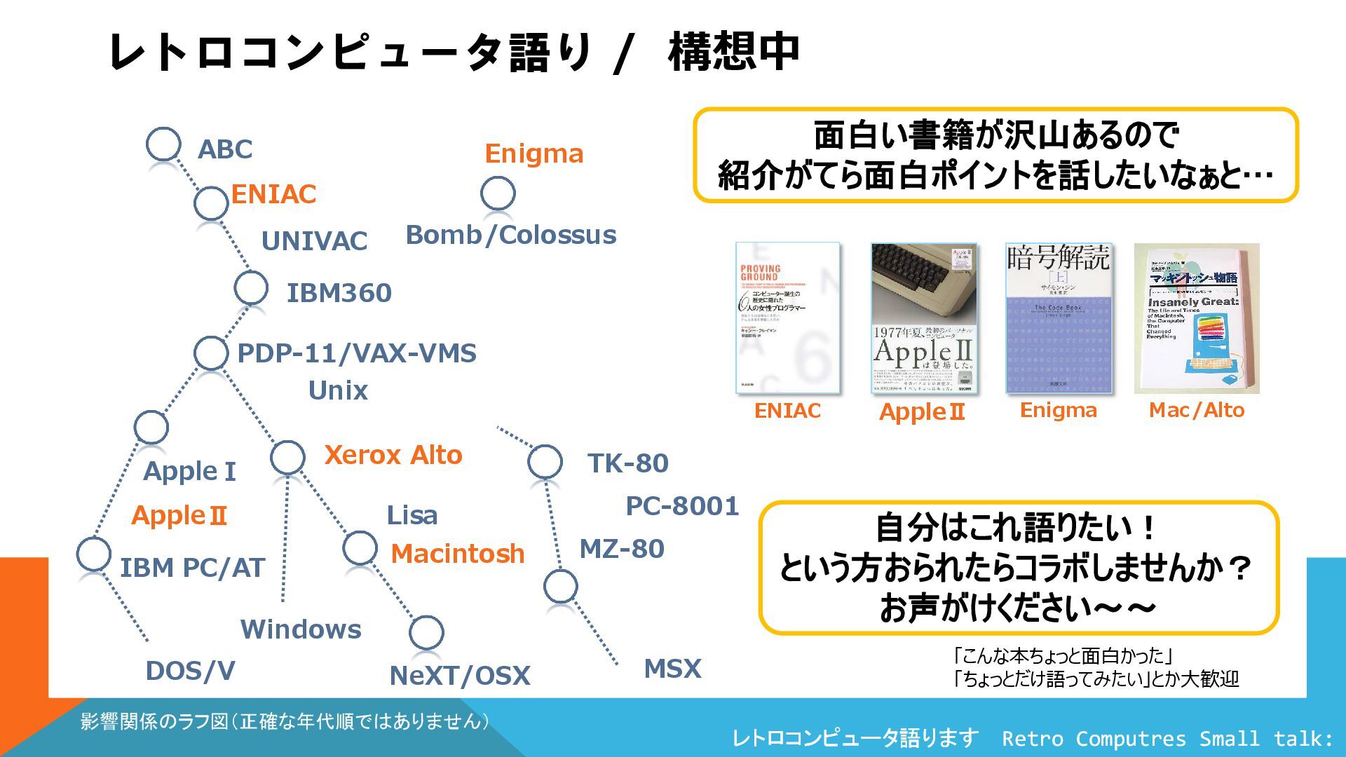 レトロコンピュータ語り / 構想中 Colossus 自分はこれ語りたい! という方おられたらコラボしませんか? お声がけください~~ ENIAC ABC UNIVAC IBM360 PDP-11/VAX-VMS Xerox Alto AppleⅠ AppleⅡ 面白い書籍が沢山あるので 紹介がてら面白ポイントを話したいなぁと… IBM PC/AT Windows MZ-80 PC-8001 TK-80 MSX Macintosh Unix Lisa DOS/V Enigma Bomb/Colossus Enigma ENIAC AppleⅡ NeXT/OSX Mac/Alto 影響関係のラフ図(正確な年代順ではありません) 「こんな本ちょっと面白かった」 「ちょっとだけ語ってみたい」とか大歓迎