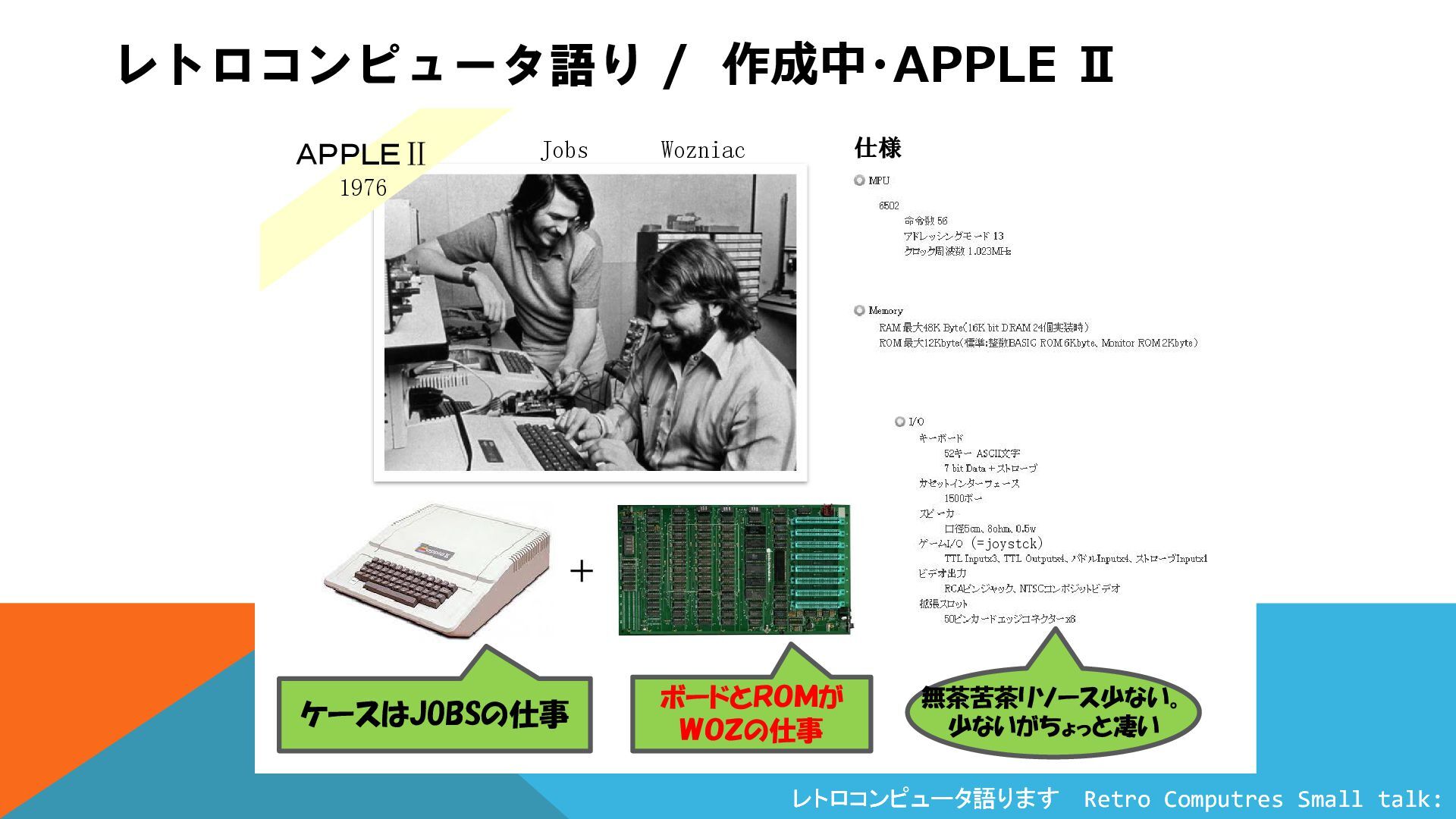 レトロコンピュータ語り / 作成中・APPLE Ⅱ ケースはJOBSの仕事 ボードとROMが WOZの仕事 + APPLEⅡ 1976 Jobs Wozniac (=joystck) 仕様 無茶苦茶リソース少ない。 少ないがちょっと凄い