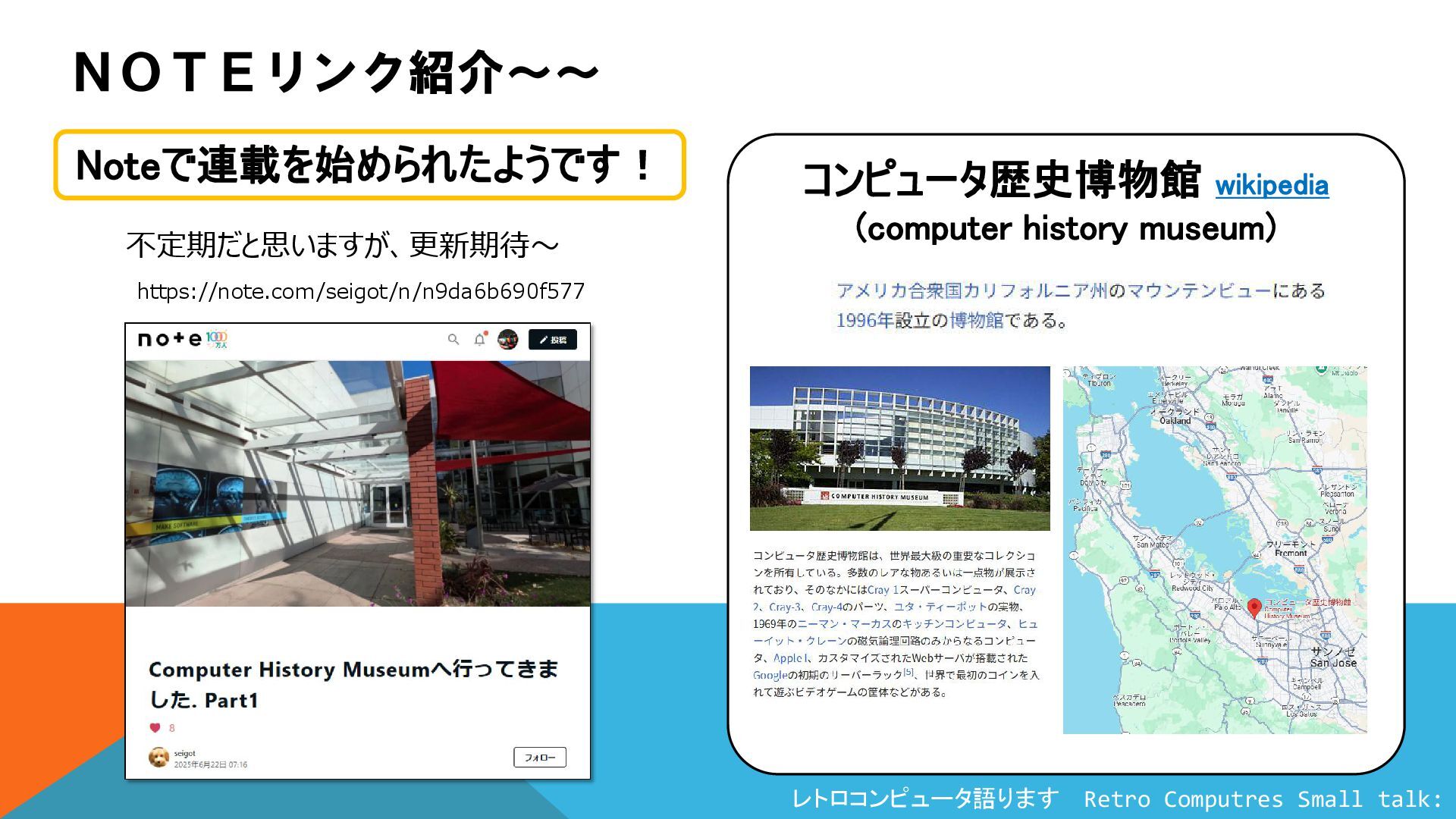 レトロコンピュータ語ります Retro Computres Small talk: NOTEリンク紹介~~ Noteで連載を始められたようです! https://note.com/seigot/n/n9da6b690f577 不定期だと思いますが、更新期待~ コンピュータ歴史博物館