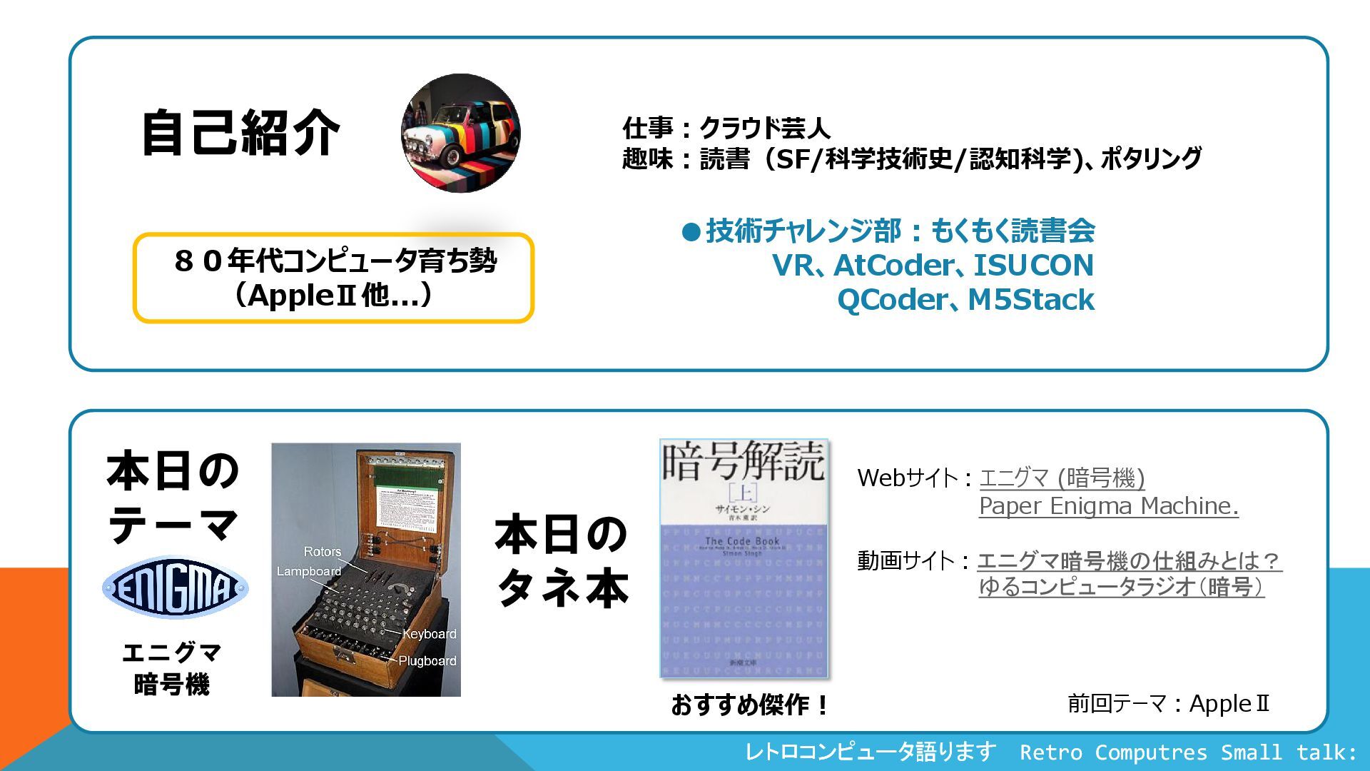 •技術チャレンジ部:もくもく読書会 VR、AtCoder、ISUCON QCoder、M5Stack 80年代コンピュータ育ち勢 (AppleⅡ他...) 仕事:クラウド芸人 趣味:読書(SF/科学技術史/認知科学)、ポタリング 自己紹介 本日の タネ本 おすすめ傑作! Webサイト:エニグマ (暗号機) Paper Enigma Machine. 動画サイト:エニグマ暗号機の仕組みとは? ゆるコンピュータラジオ(暗号) 本日の テーマ エニグマ 暗号機 前回テーマ:AppleⅡ
