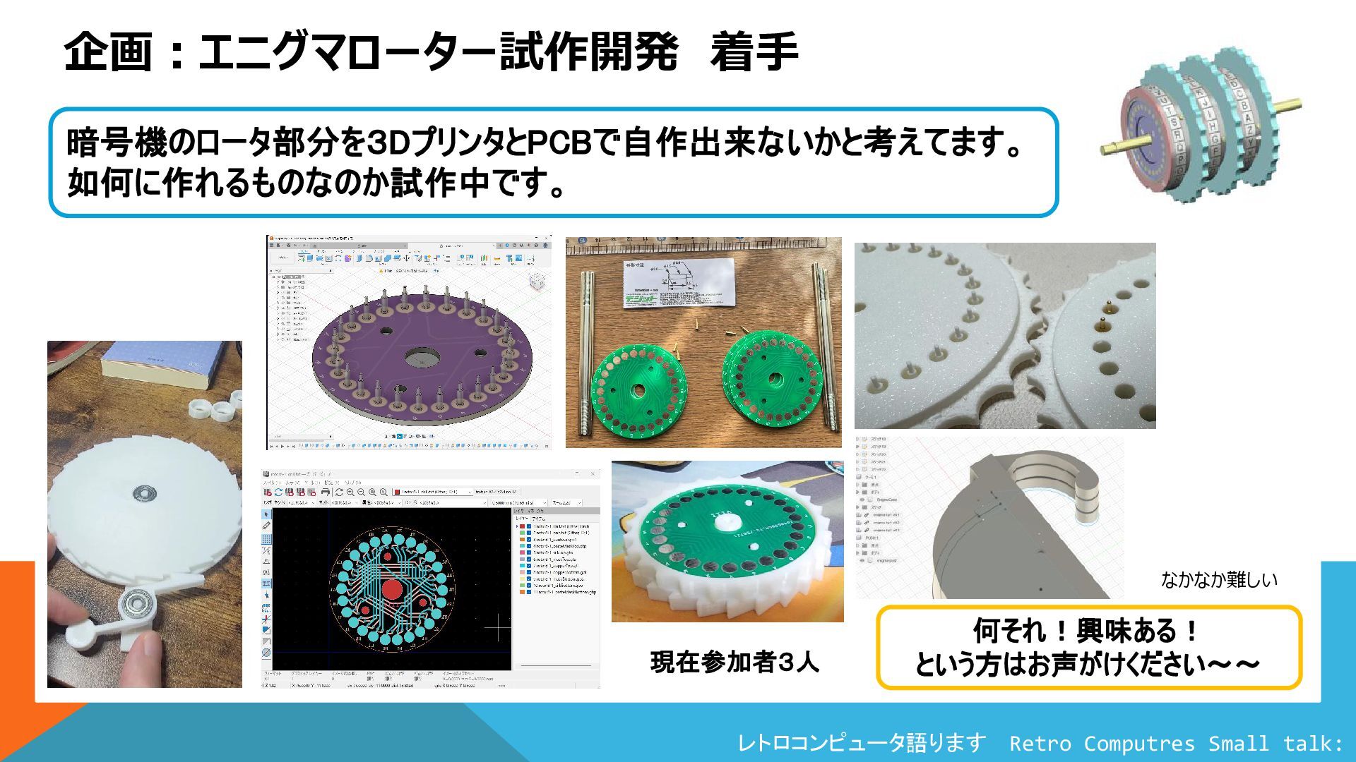 レトロコンピュータ語ります Retro Computres Small talk: Colossus 企画:エニグマローター試作開発 着手 何それ!興味ある! という方はお声がけください~~ 暗号機のロータ部分を3DプリンタとPCBで自作出来ないかと考えてます。