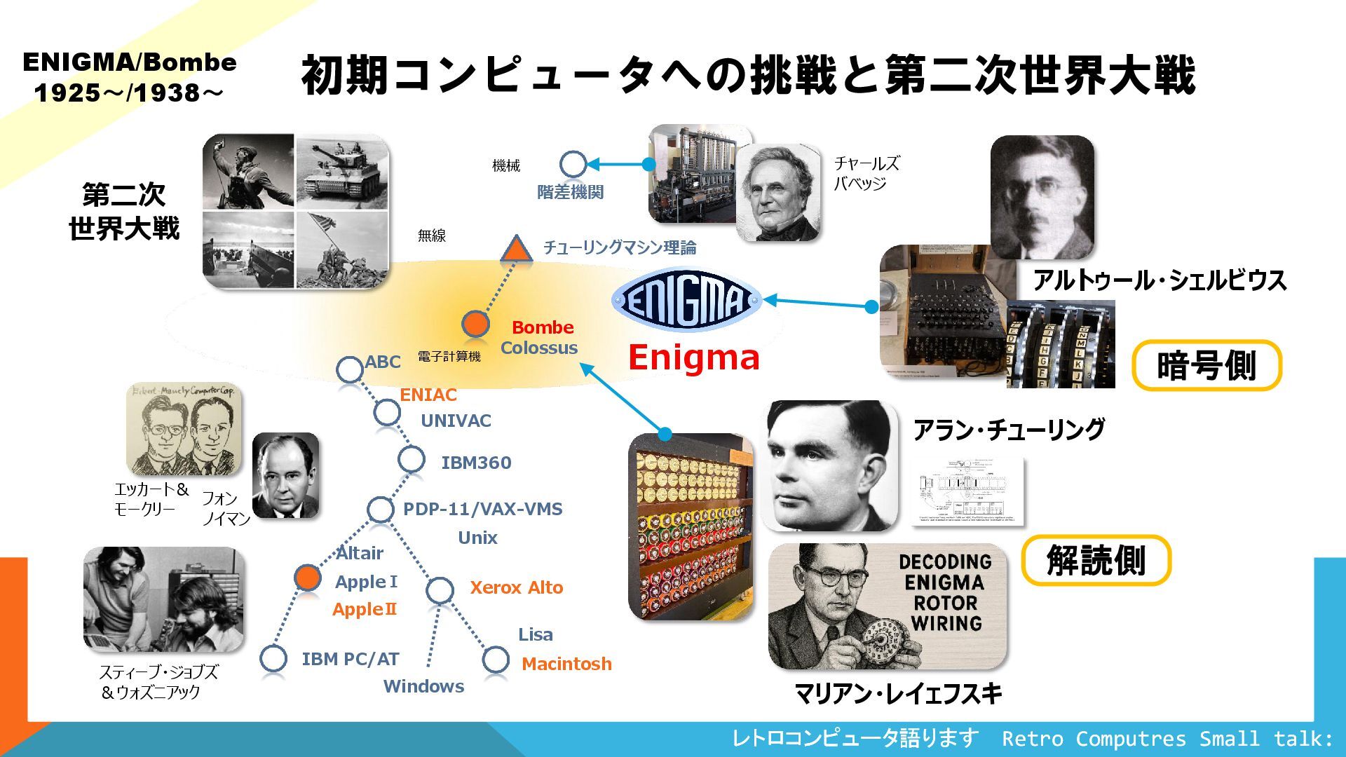 Colossus ENIAC ABC UNIVAC IBM360 PDP-11/VAX-VMS Xerox Alto AppleⅠ AppleⅡ IBM PC/AT Windows Macintosh Unix Lisa Enigma Bombe Colossus 初期コンピュータへの挑戦と第二次世界大戦 ENIGMA/Bombe 1925~/1938~ Altair 階差機関 チューリングマシン理論 チャールズ バベッジ アラン・チューリング マリアン・レイェフスキ アルトゥール・シェルビウス エッカート& モークリー フォン ノイマン スティーブ・ジョブズ &ウォズニアック 第二次 世界大戦 暗号側 解読側 機械 無線 電子計算機