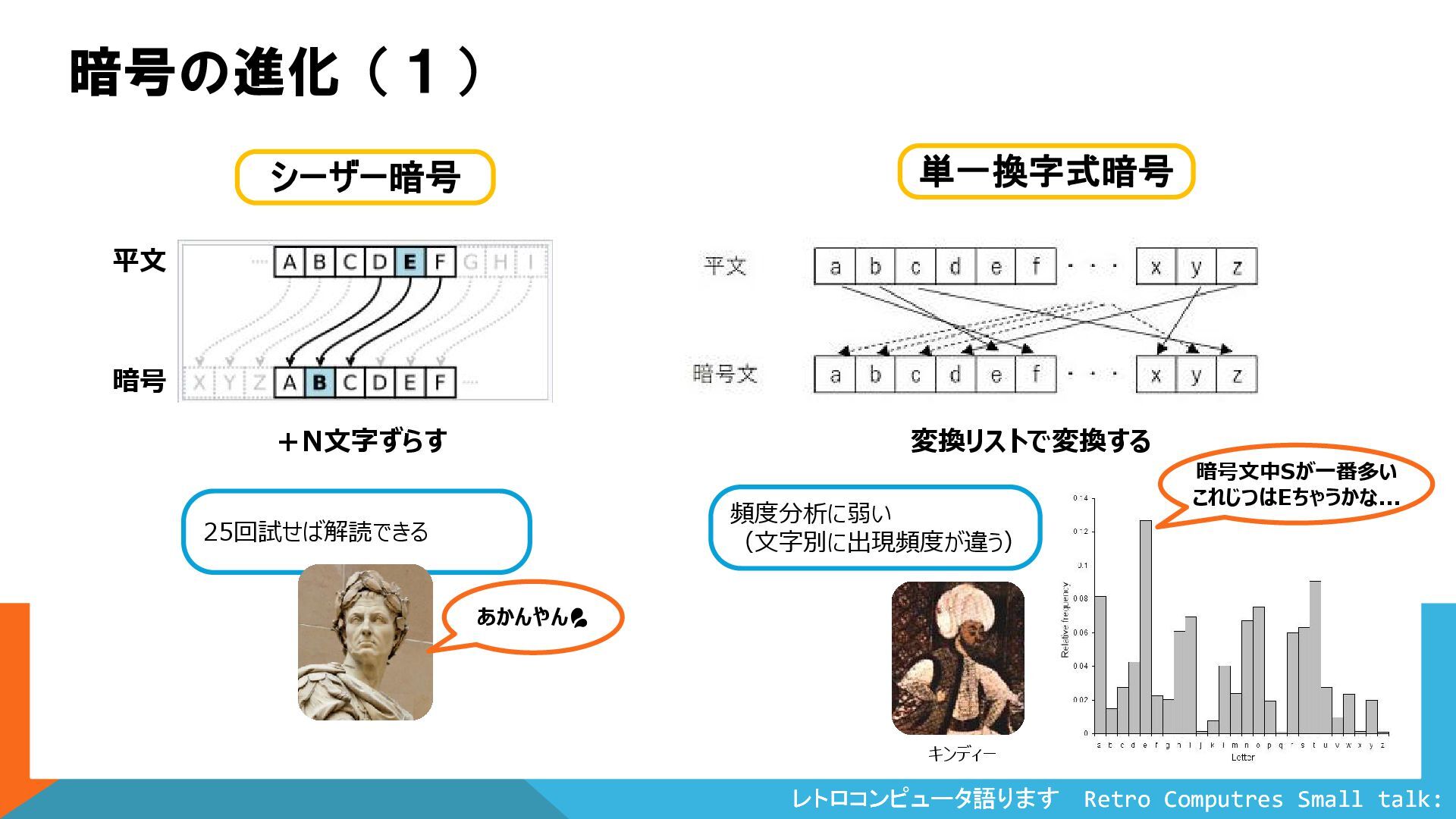 Colossus 暗号の進化(1) シーザー暗号 +N文字ずらす 暗号 平文 25回試せば解読できる 単一換字式暗号 変換リストで変換する 頻度分析に弱い (文字別に出現頻度が違う) 暗号文中Sが一番多い これじつはEちゃうかな... あかんやん キンディー