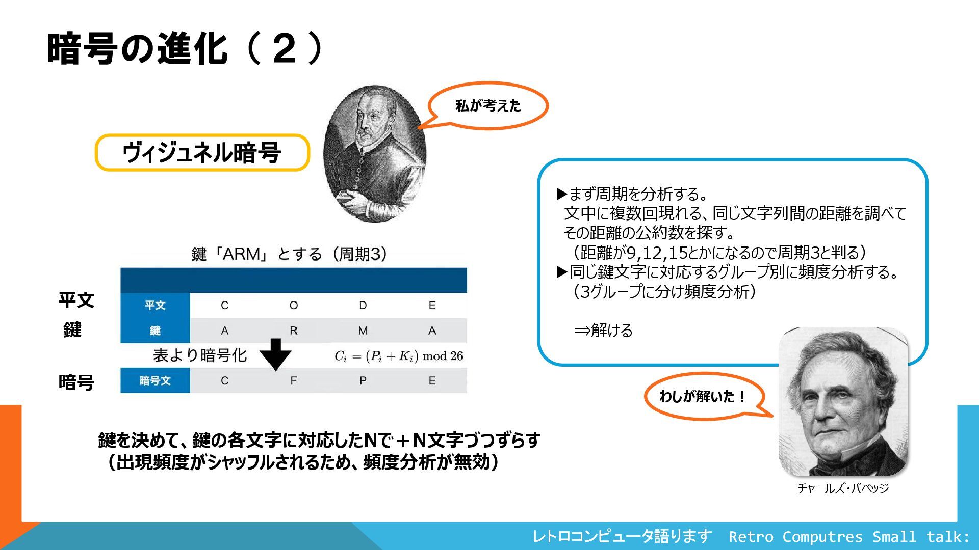 Colossus ヴィジュネル暗号 鍵を決めて、鍵の各文字に対応したNで+N文字づつずらす (出現頻度がシャッフルされるため、頻度分析が無効) 暗号 平文 ▶まず周期を分析する。 文中に複数回現れる、同じ文字列間の距離を調べて その距離の公約数を探す。 (距離が9,12,15とかになるので周期3と判る) ▶同じ鍵文字に対応するグループ別に頻度分析する。 (3グループに分け頻度分析) ⇒解ける 鍵 暗号の進化(2) 私が考えた わしが解いた! チャールズ・バベッジ