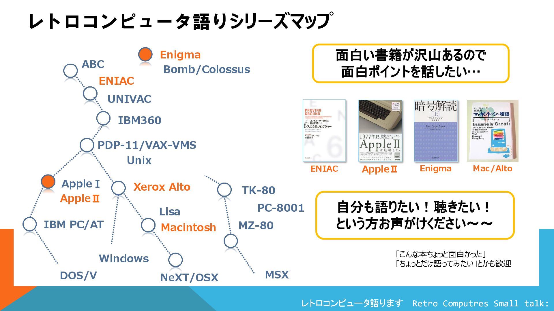レトロコンピュータ語りシリーズマップ Colossus 自分も語りたい!聴きたい! という方お声がけください~~ ENIAC ABC UNIVAC IBM360 PDP-11/VAX-VMS Xerox Alto AppleⅠ AppleⅡ 面白い書籍が沢山あるので 面白ポイントを話したい… IBM PC/AT Windows MZ-80 PC-8001 TK-80 MSX Macintosh Unix Lisa DOS/V Enigma Bomb/Colossus Enigma ENIAC AppleⅡ NeXT/OSX Mac/Alto 「こんな本ちょっと面白かった」 「ちょっとだけ語ってみたい」とかも歓迎