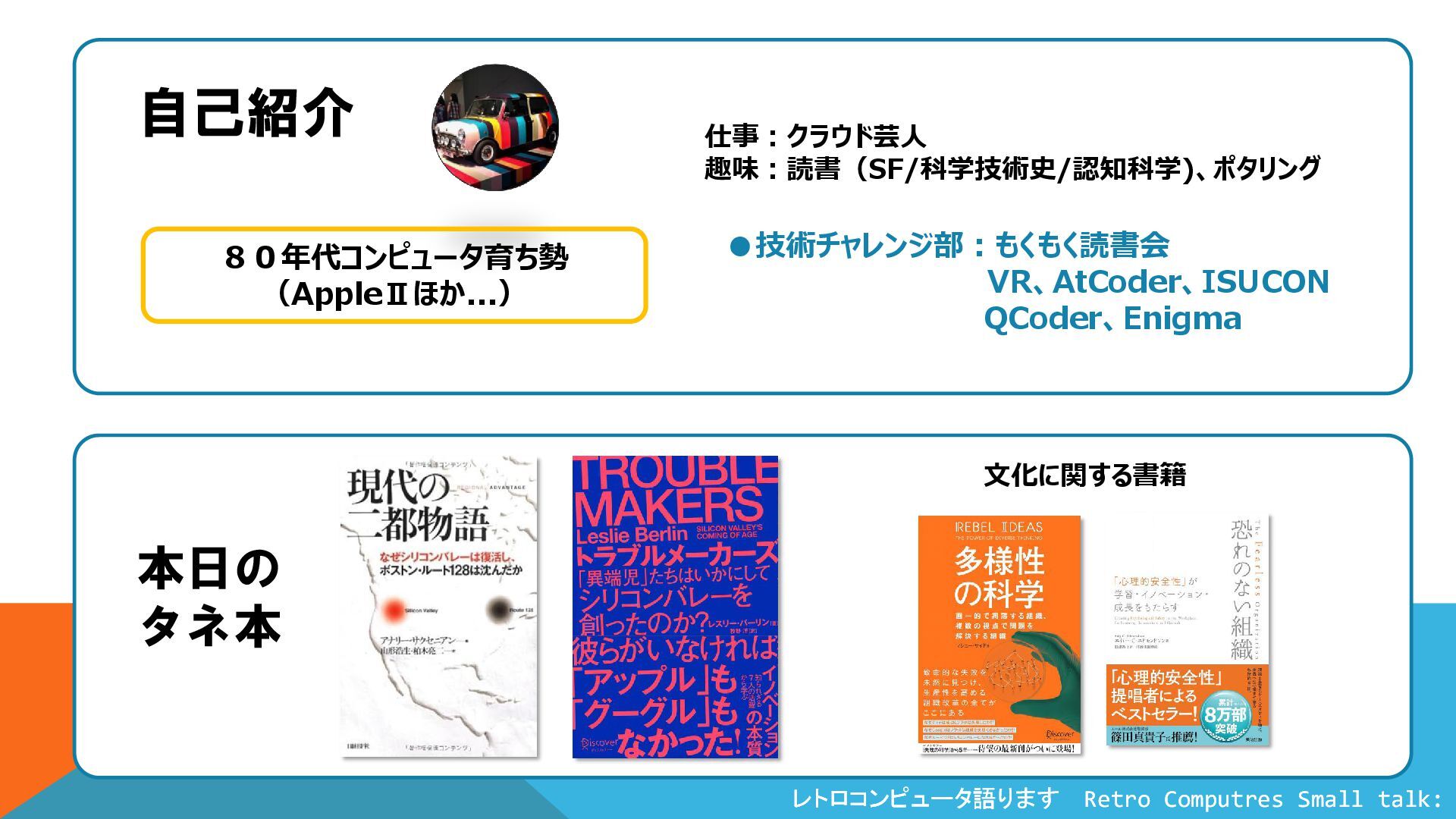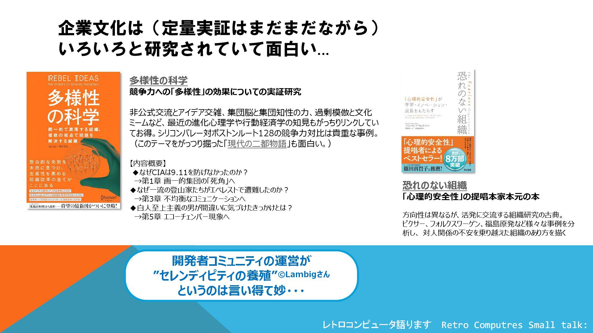 企業文化は(定量実証はまだまだながら) いろいろと研究されていて面白い... 多様性の科学 競争力への「多様性」の効果についての実証研究 非公式交流とアイデア交雑、集団脳と集団知性の力、過剰模倣と文化 ミームなど、最近の進化心理学や行動経済学の知見もがっちりリンクしてい てお得。シリコンバレー対ボストンルート128の競争力対比は貴重な事例。 (このテーマをがっつり掘った「現代の二都物語」も面白い。) 【内容概要】 ◆なぜCIAは9.11を防げなかったのか? →第1章 画一的集団の「死角」へ ◆なぜ一流の登山家たちがエベレストで遭難したのか? →第3章 不均衡なコミュニケーションへ ◆白人至上主義の男が間違いに気づけたきっかけとは? →第5章 エコーチェンバー現象へ 開発者コミュニティの運営が ”セレンディピティの養殖”©Lambigさん というのは言い得て妙・・・ 恐れのない組織 「心理的安全性」の提唱本家本元の本 方向性は異なるが、活発に交流する組織研究の古典。 ピクサー、フォルクスワーゲン、福島原発など様々な事例を分 析し、 対人関係の不安を乗り越えた組織のあり方を描く