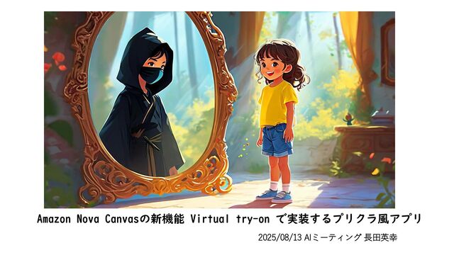 AIミーティング 2025/08/13 #ChatGPT #Cursor #Geminiにてタイトル「Amazon Nova Canvasの新機能Virtual try-onで実装するプリクラ風アプリ」でLT登壇した際の資料です。