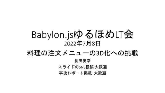 Babylon.jsゆるほめLT会 2022年7月8日 料理の注文メニューの3D化への挑戦 長田英幸 スライドのSNS投稿 大歓迎 事後レポート掲載 大歓迎